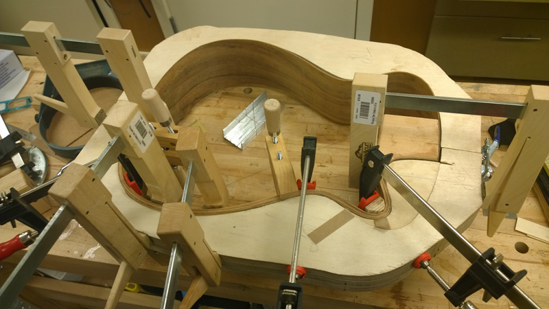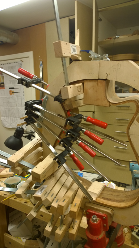 Ultimatly I am glad I had the time with the fish glue as there was some jockeying of clamps before I was happy. I started with the cutaway side. the neck day I did the non cutaway side.
