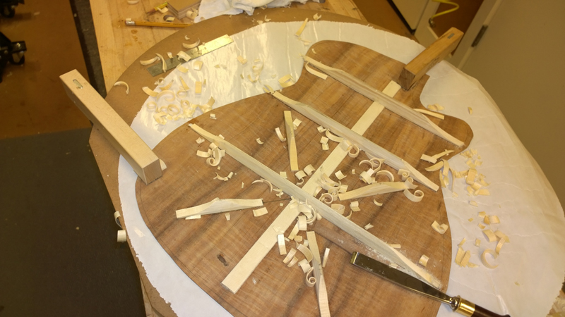 I have the body components finished and am in the process of cleaning things up and fitting the top and back on to the rims. This guitar is designed to have an active back so I thinned the back down a bit more than I normally would, used the plans 3 meter radius (well I used 10 feet) and used the plans active bracing pattern.