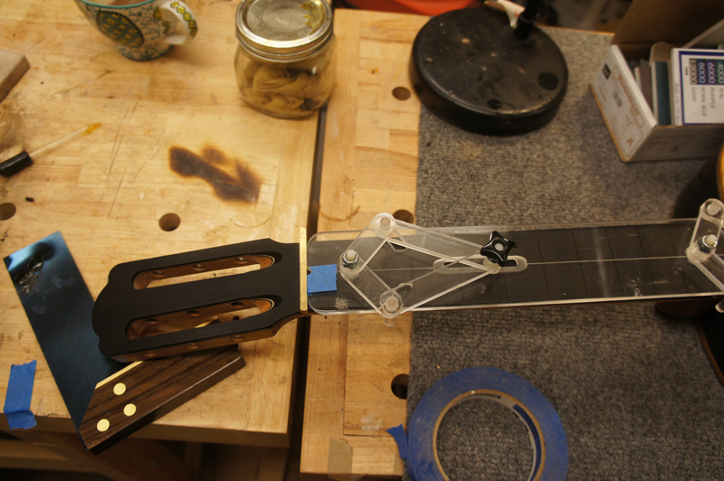 I used my luthier suppliers center line tool to place and square the bridge to the neck. I use a 1/4 brass bar to set my nut spacing, in this case I can use it to assure the tool is at the nut position. I have marks for the different sized fret boards I use. A note of caution to those who read this, double check fret measuring tool. I have an ibex fret ruler and its standard classical scale is not any standard I know. It would have placed the bridge about 4 mm long. (that is more than the 652 I was looking for.)