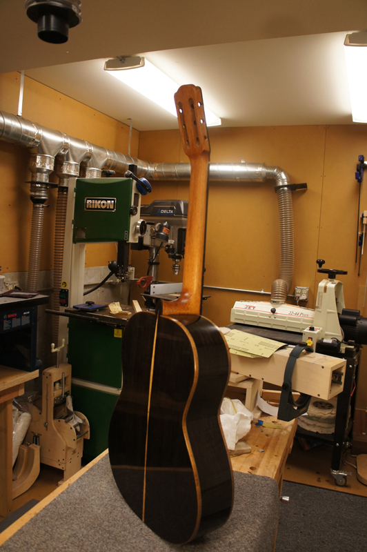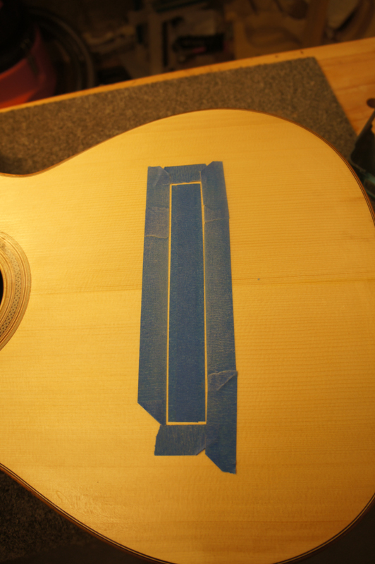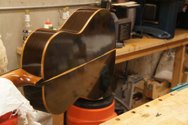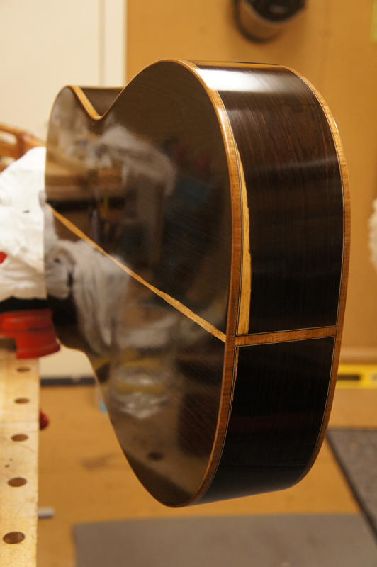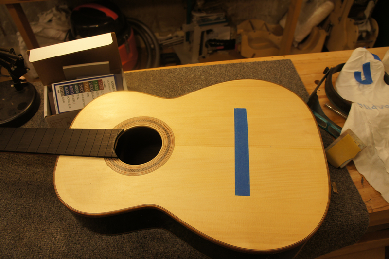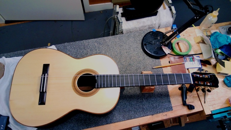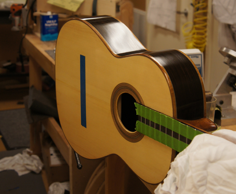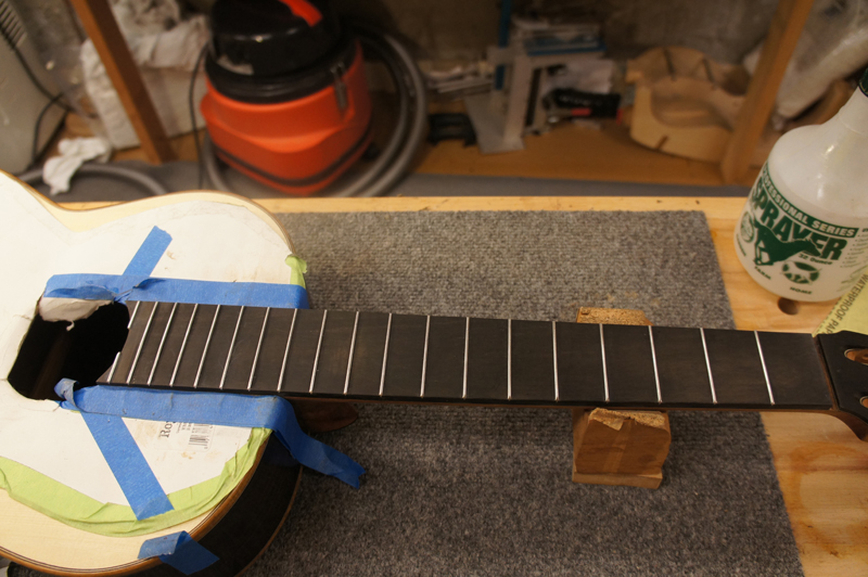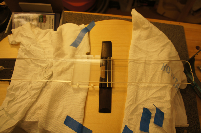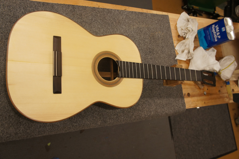I still have a bit of FP to do on the back and sides but I thought I would place the bridge, fret the guitar and prep the top for FP before I went back to finishing.