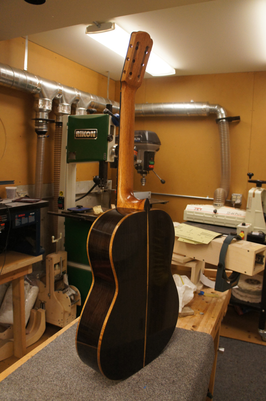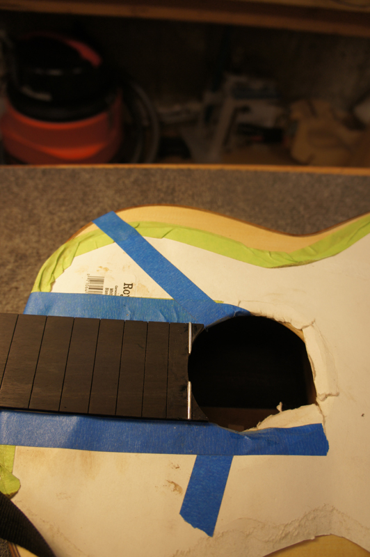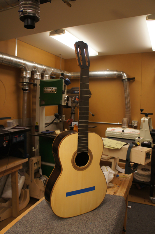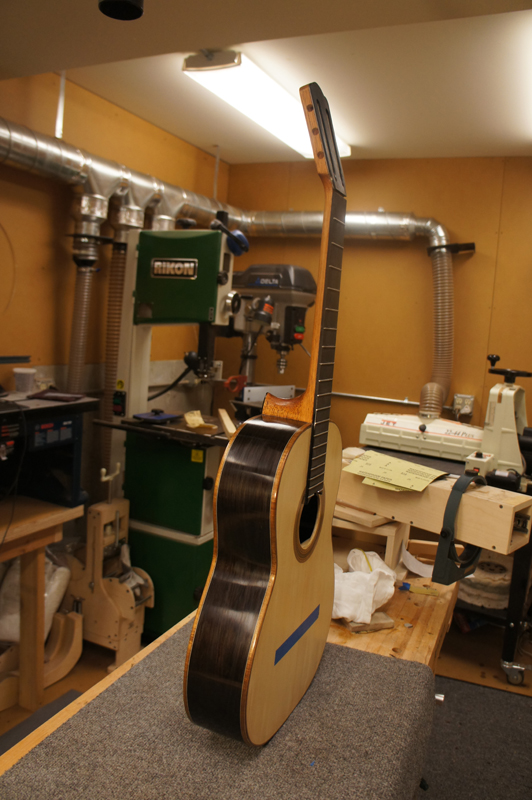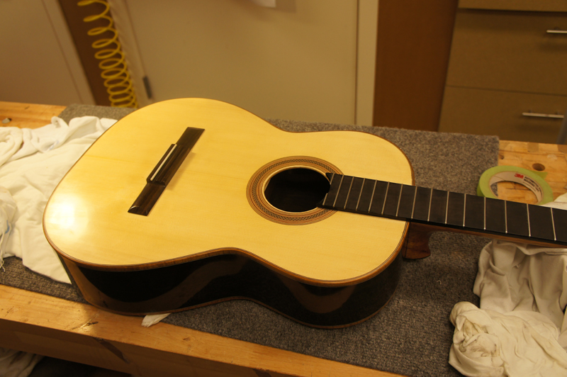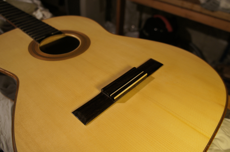 In any case I made a rough cut nut and saddle, stung the E strings and got to hear the guitar.