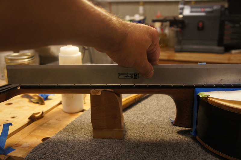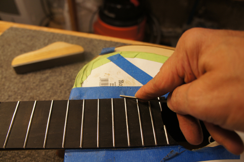 Part of the advantage of putting the frets on after gluing the fret board to the neck. I was able to level sand the fret board in location. Each and every fret is touching the straight edge. There was no need to level and redress the frets.