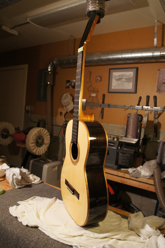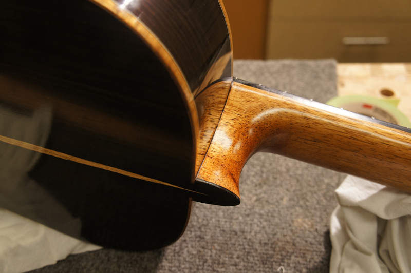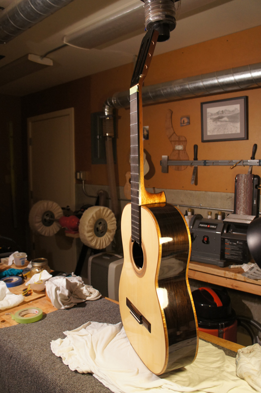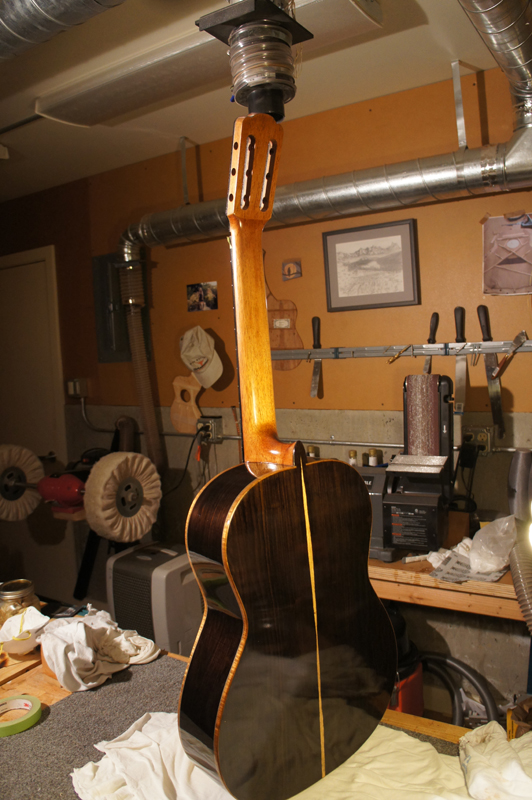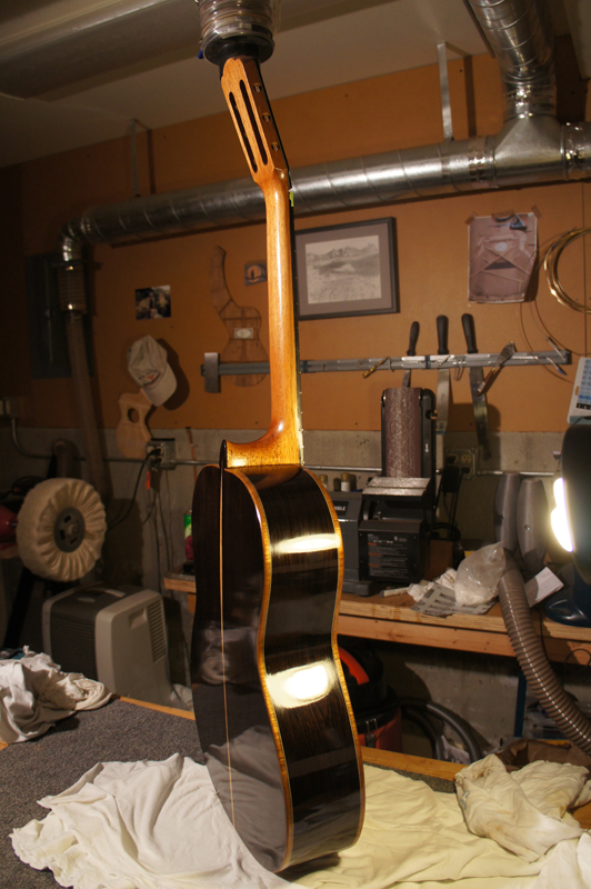 I finished the FP today on the body. I still have just a bit of work to do on the neck and head plate veneer and after the finish cures for a day or two I will hand buff the finish. Here are a few pictures on how it turned out. The next post will be in show it off.