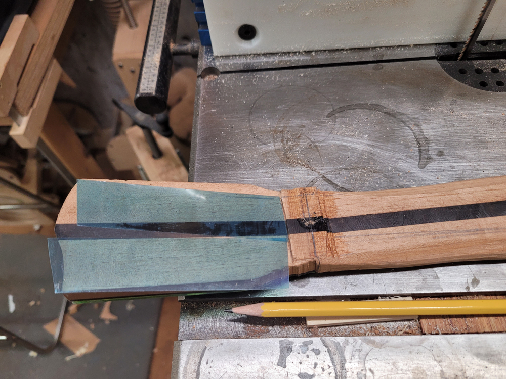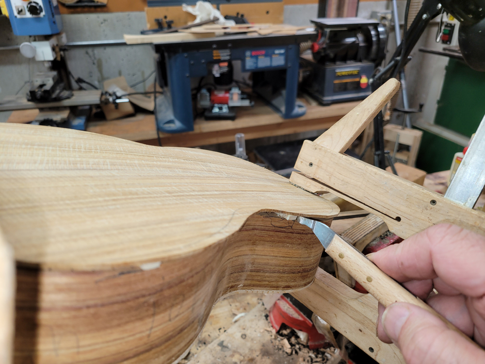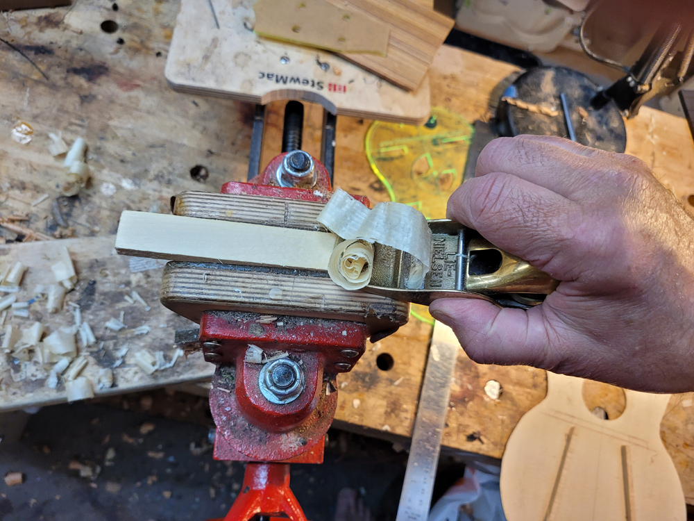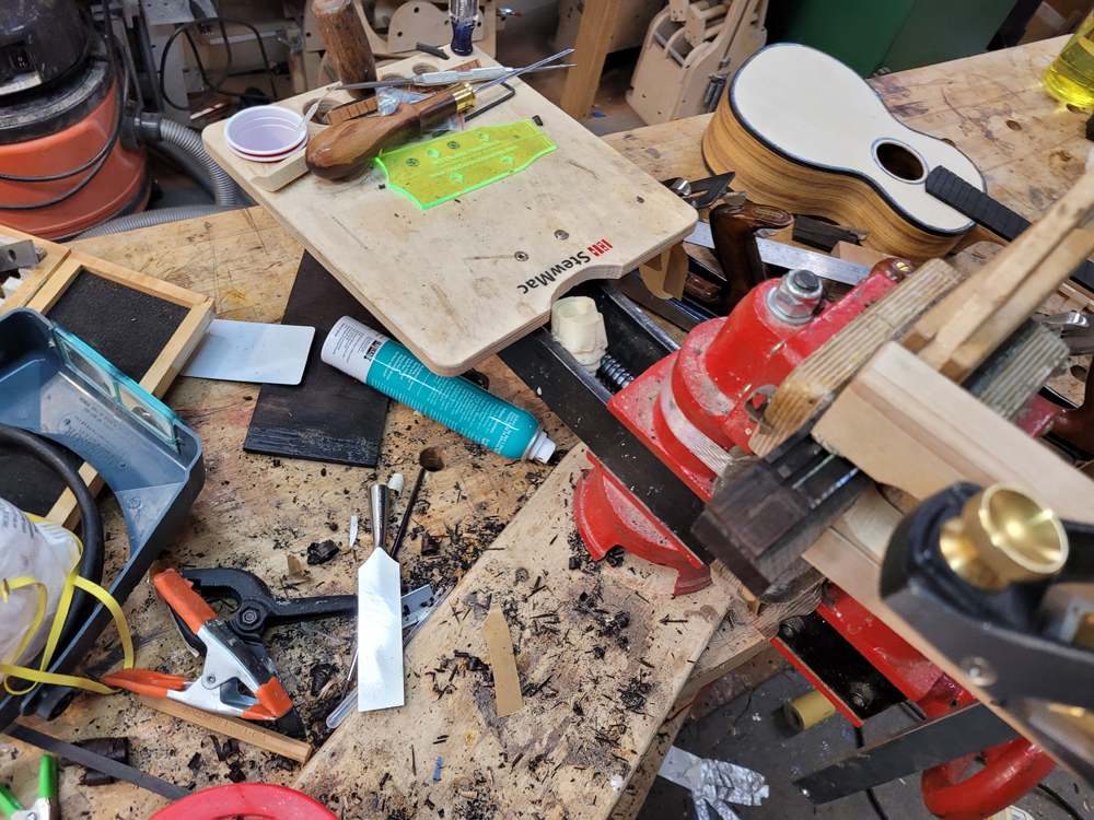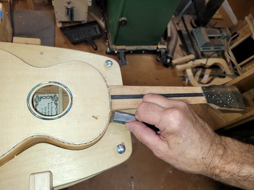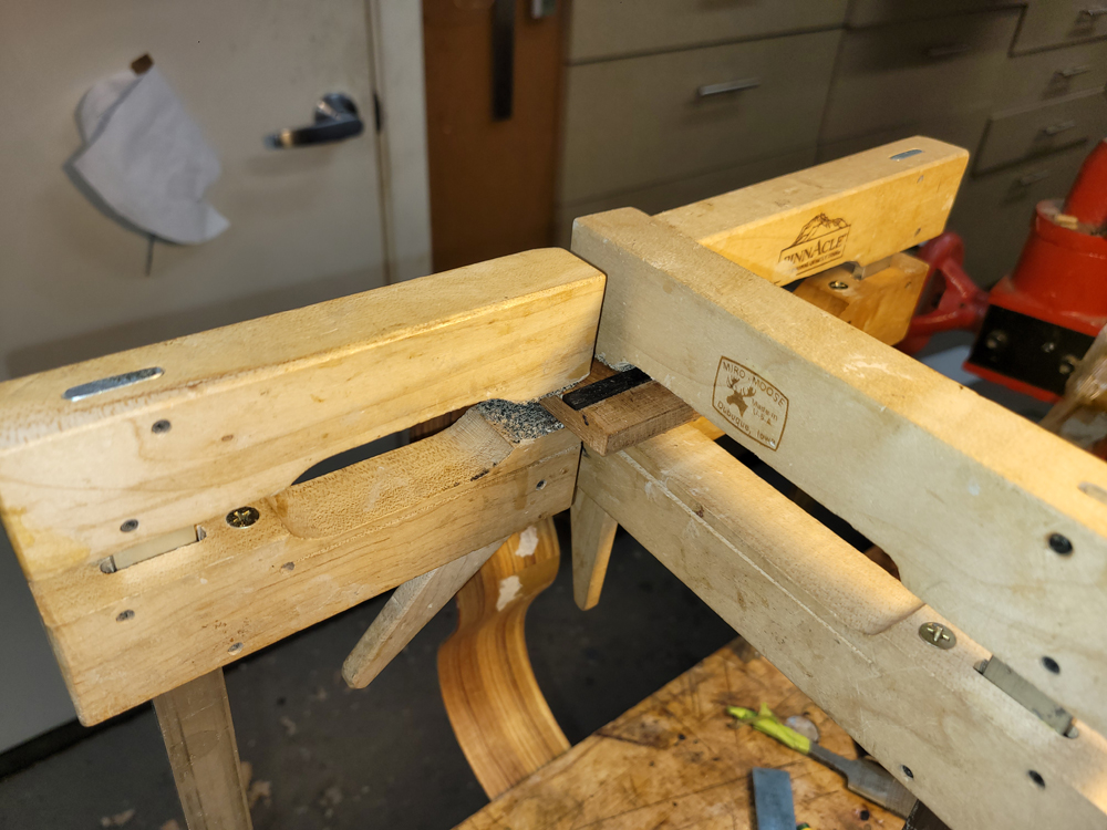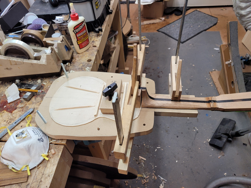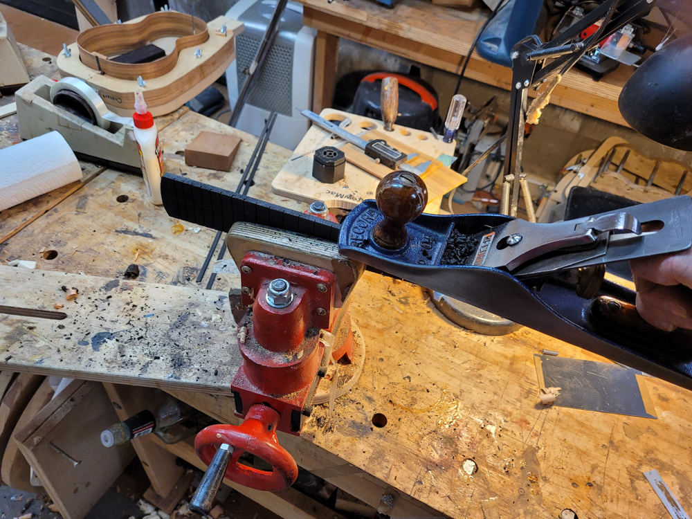 I have mostly been doing website maintenance the last few days, but I did get a bit of time on the rims and cleaned up the neck. I use a Safe-T-Planer for both the headstock and the taper of the neck, shimming up the nut side to get the thickness right.
