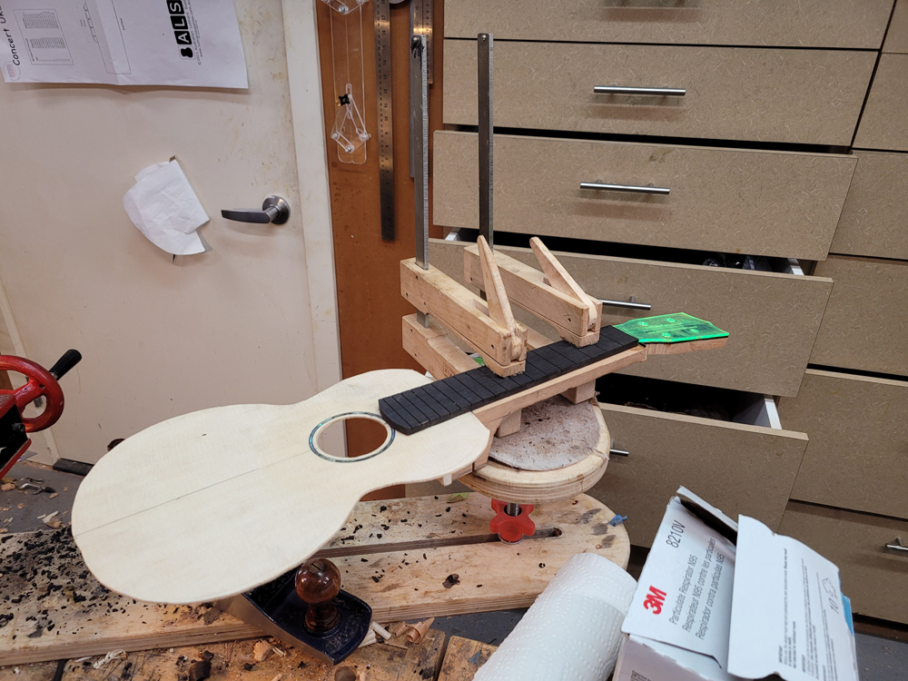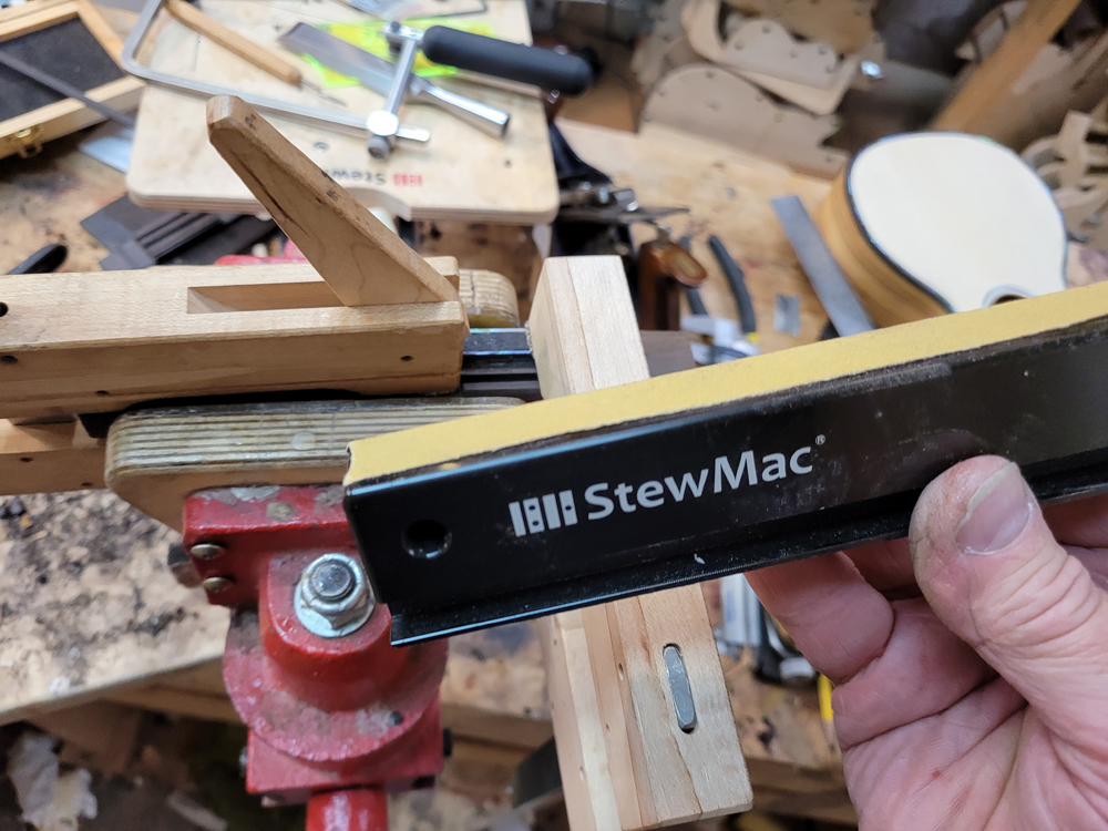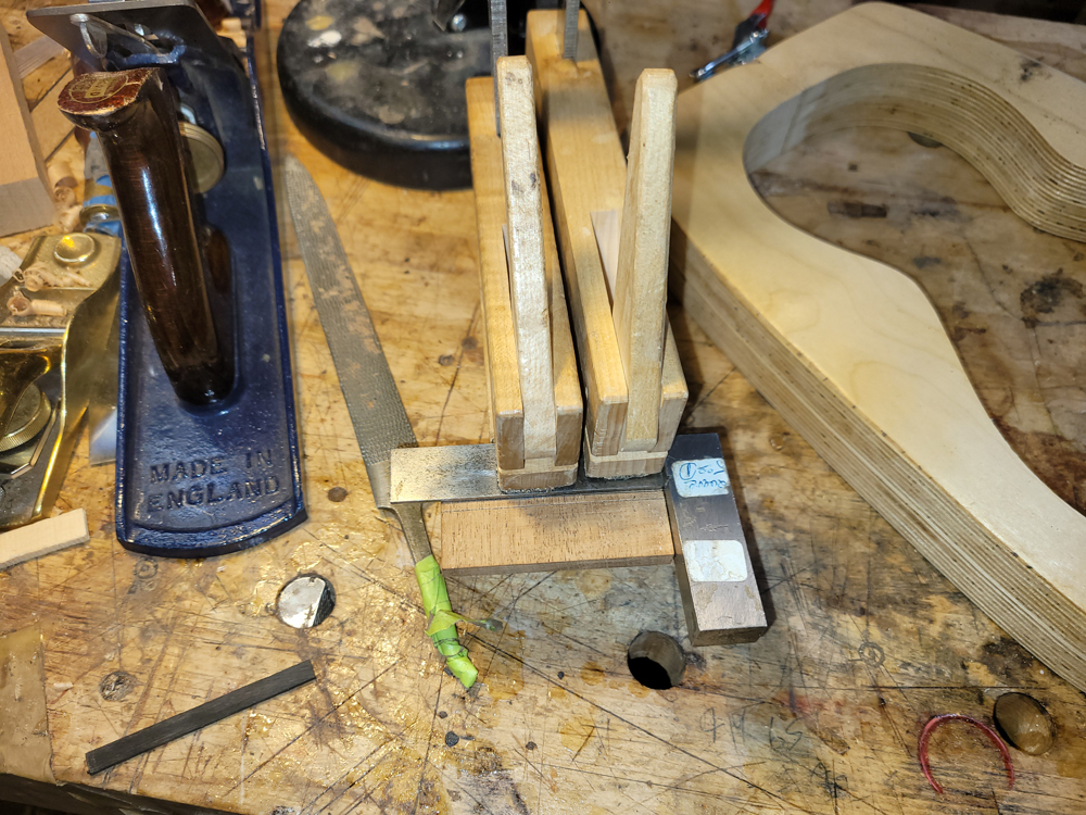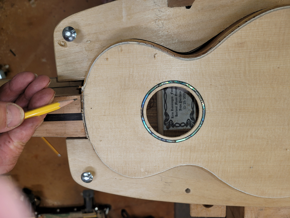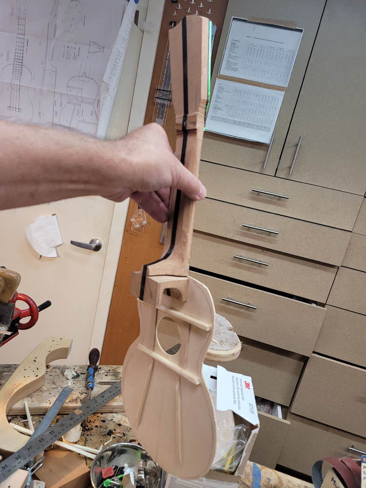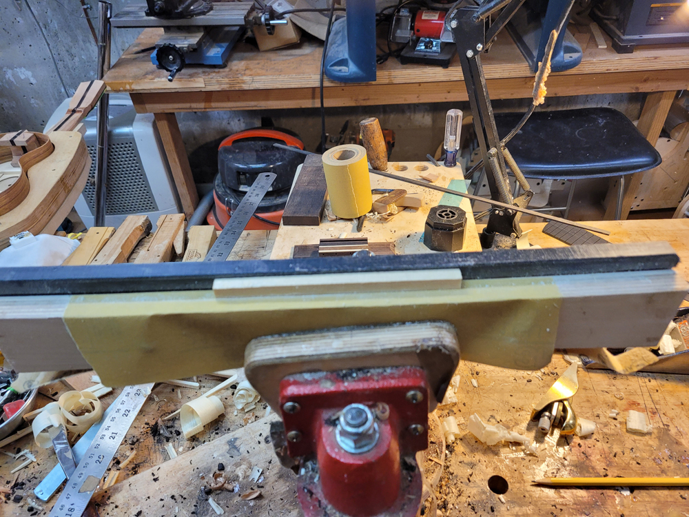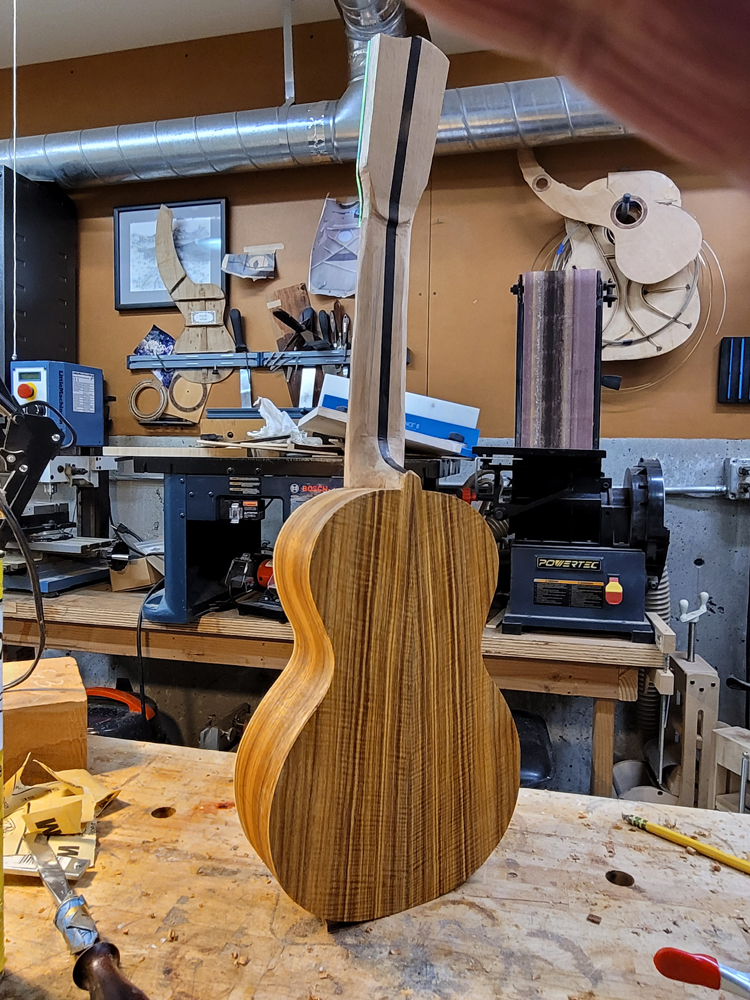 I have mostly been doing website maintenance the last few days, but I did get a bit of time on the rims and cleaned up the neck. I use a Safe-T-Planer for both the headstock and the taper of the neck, shimming up the nut side to get the thickness right.