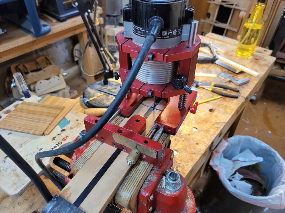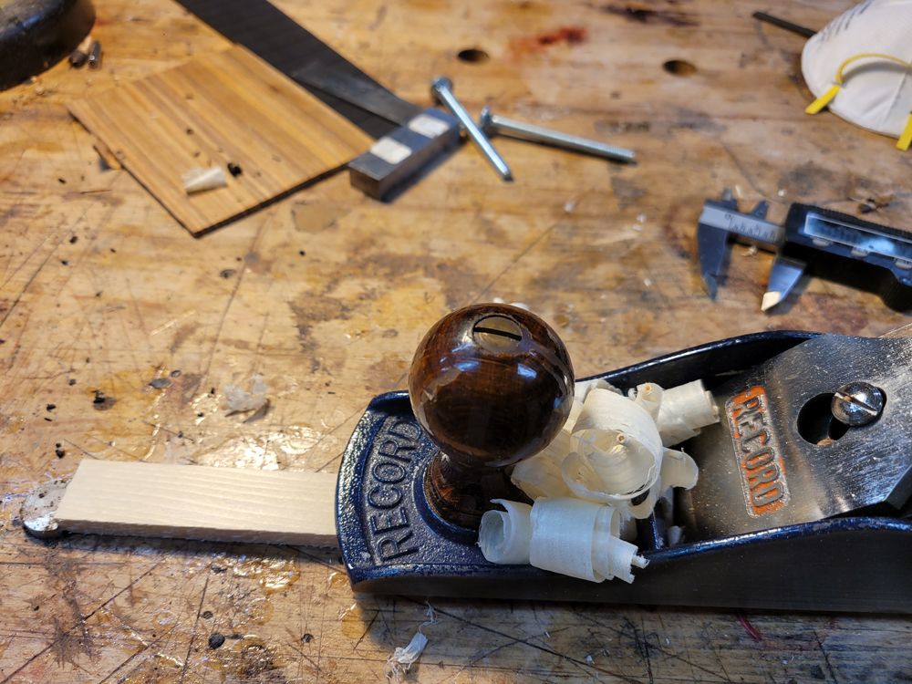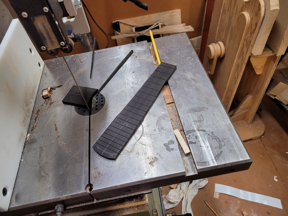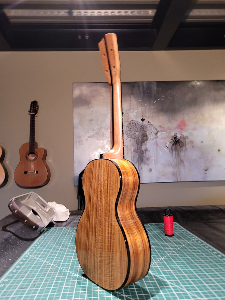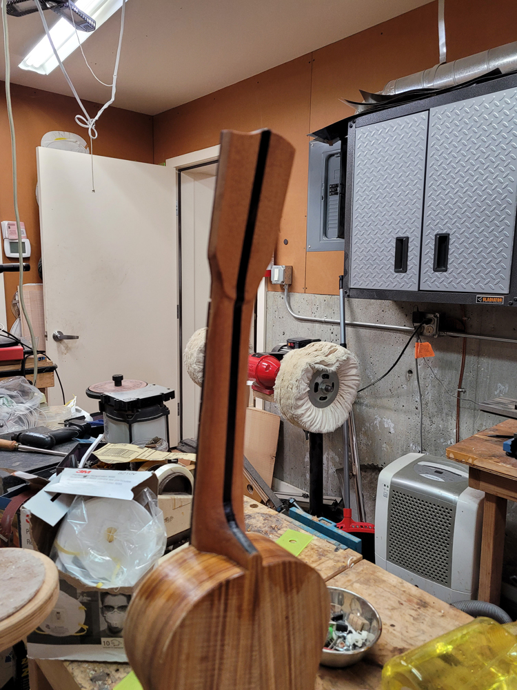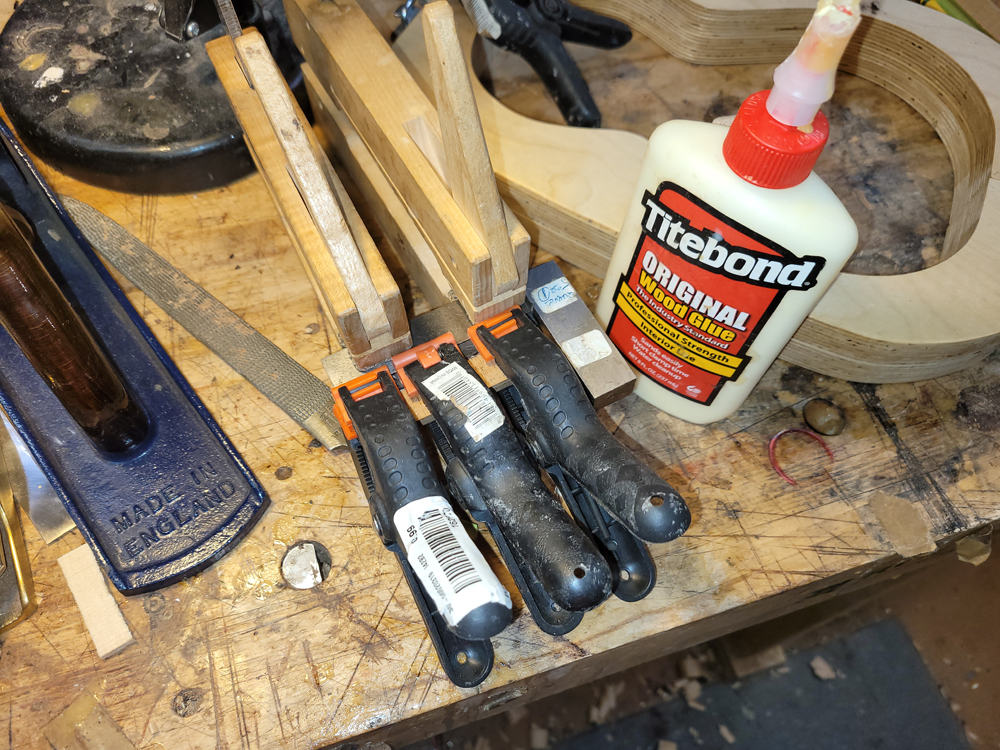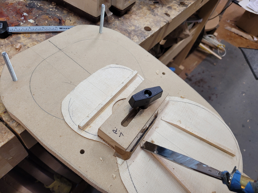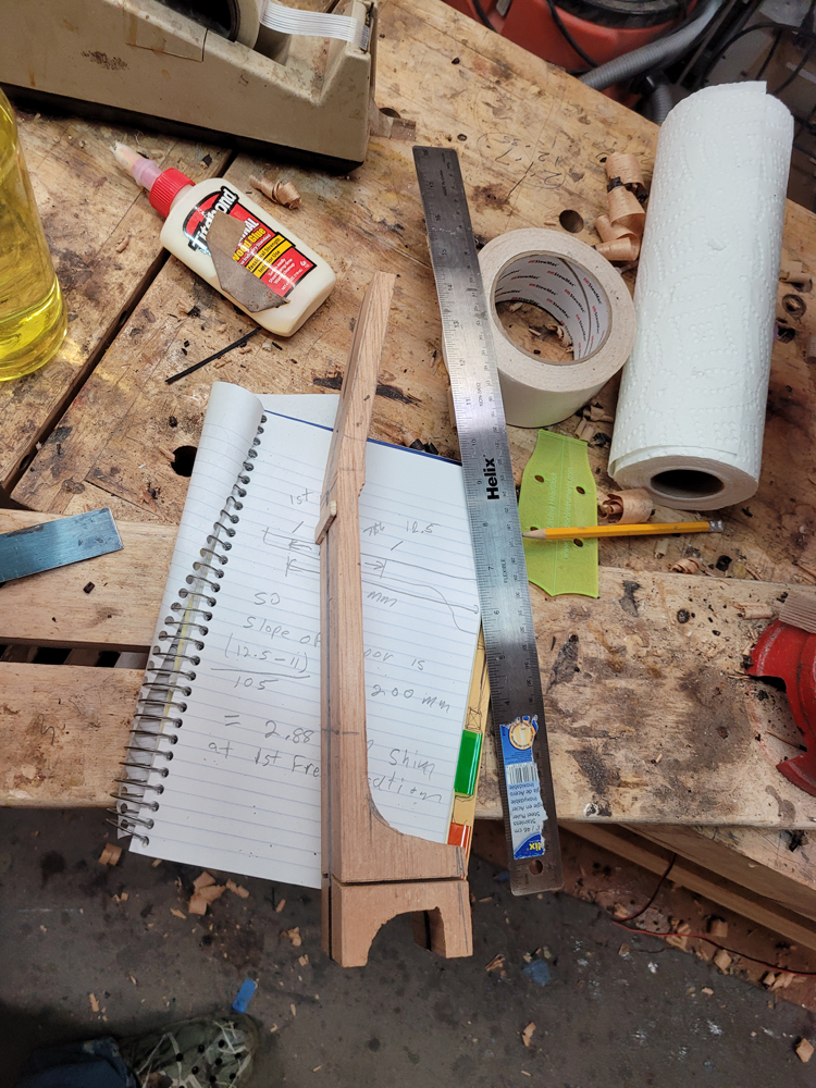 I have mostly been doing website maintenance the last few days, but I did get a bit of time on the rims and cleaned up the neck. I use a Safe-T-Planer for both the headstock and the taper of the neck, shimming up the nut side to get the thickness right.