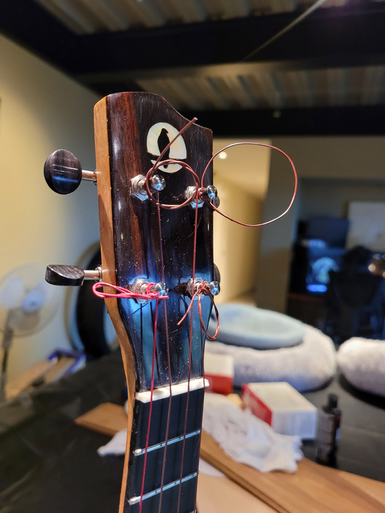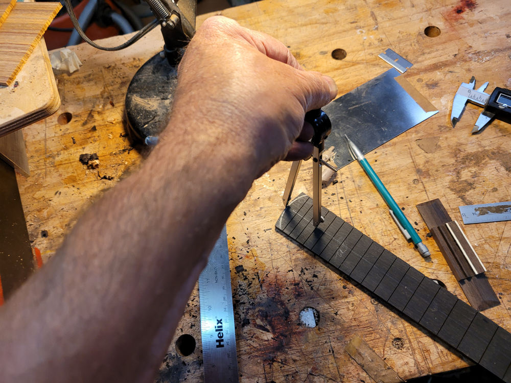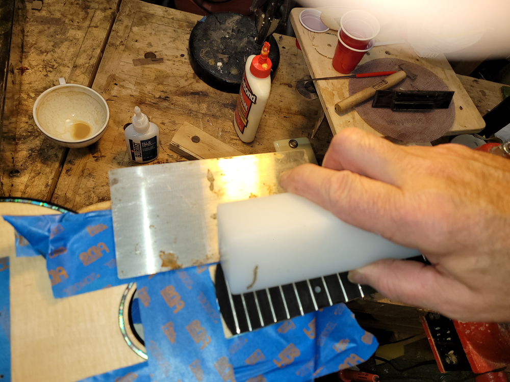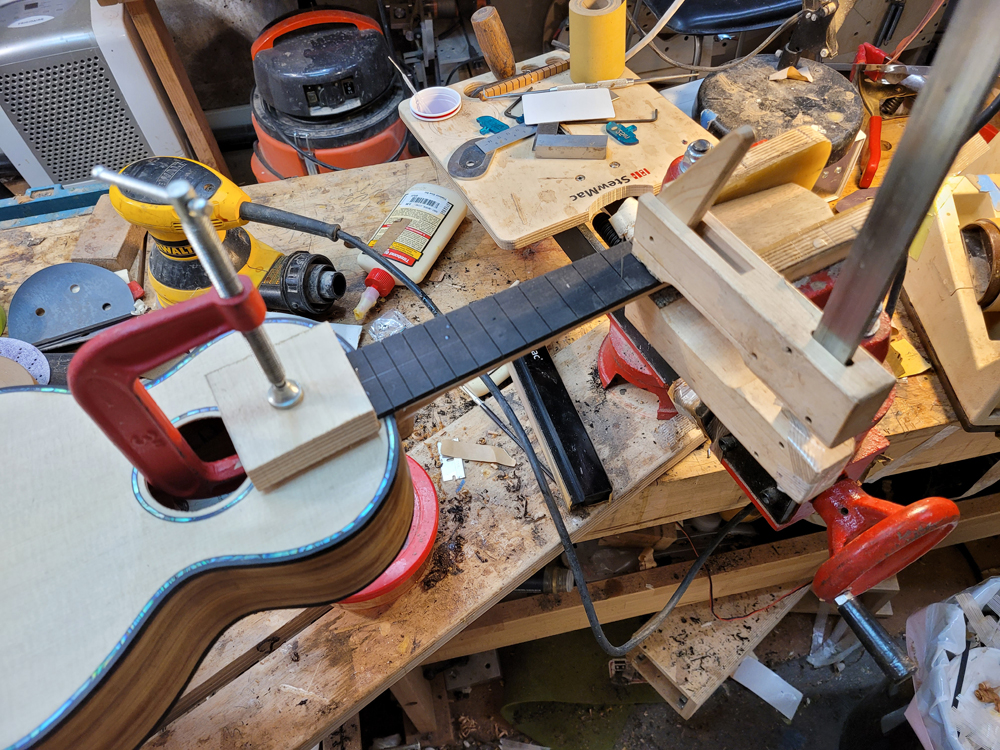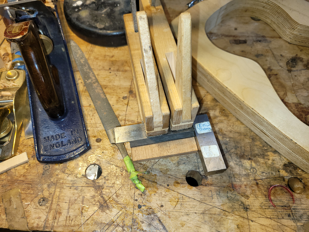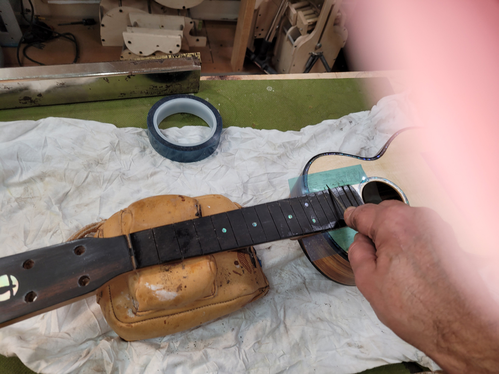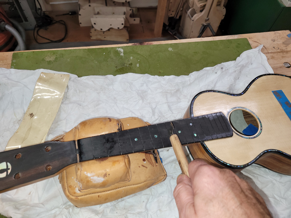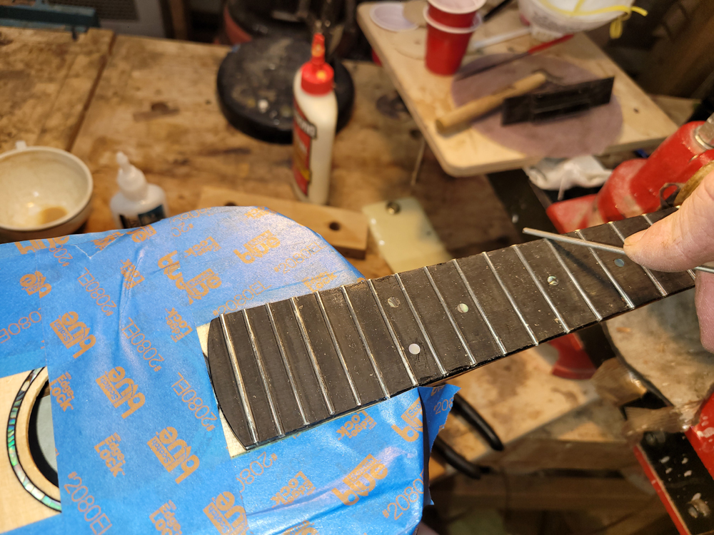 I fretted the instrument before spraying to avoid damaging the finish on the neck. Just hammered them all in after cleaning and prepping the slots, with diluted Titebond in the slots before hammering.