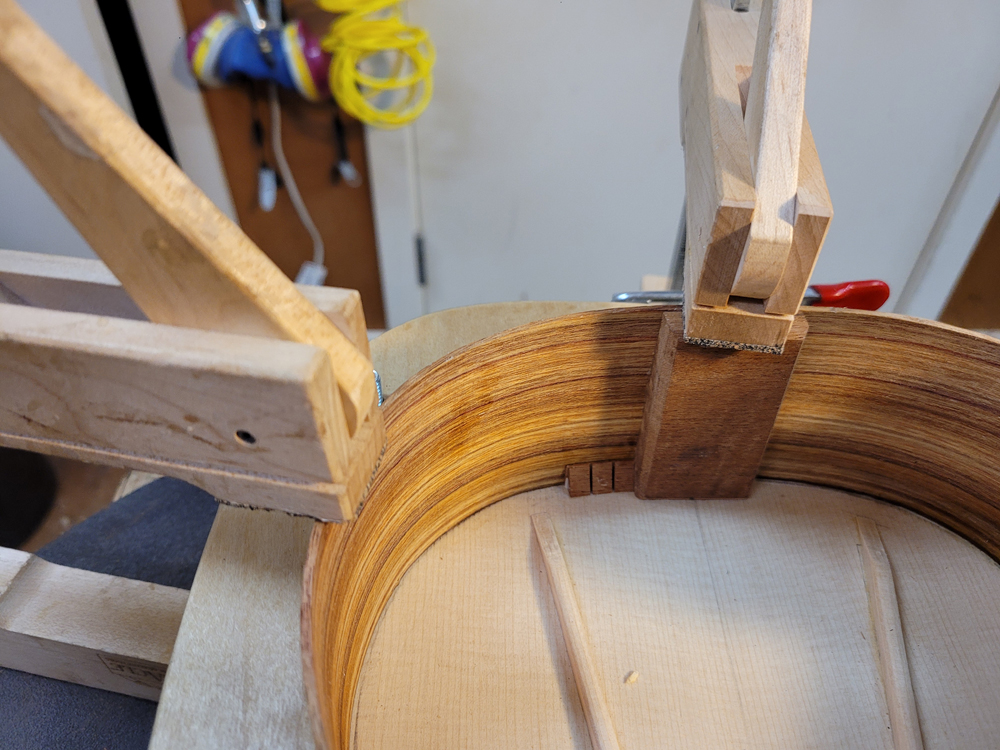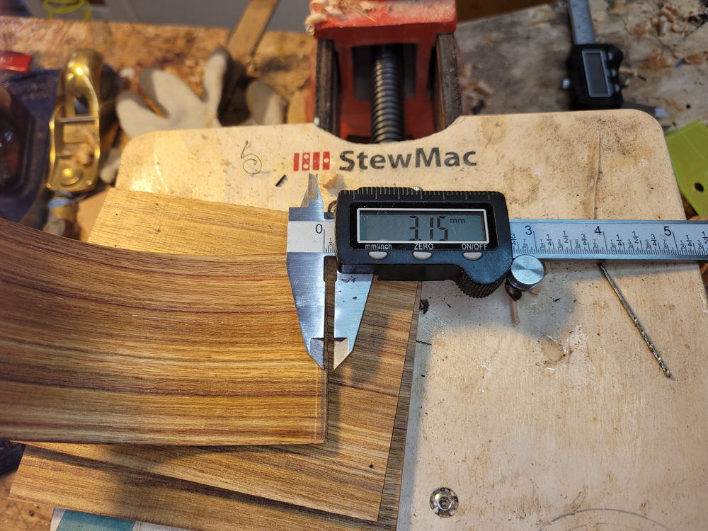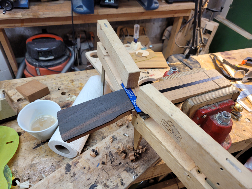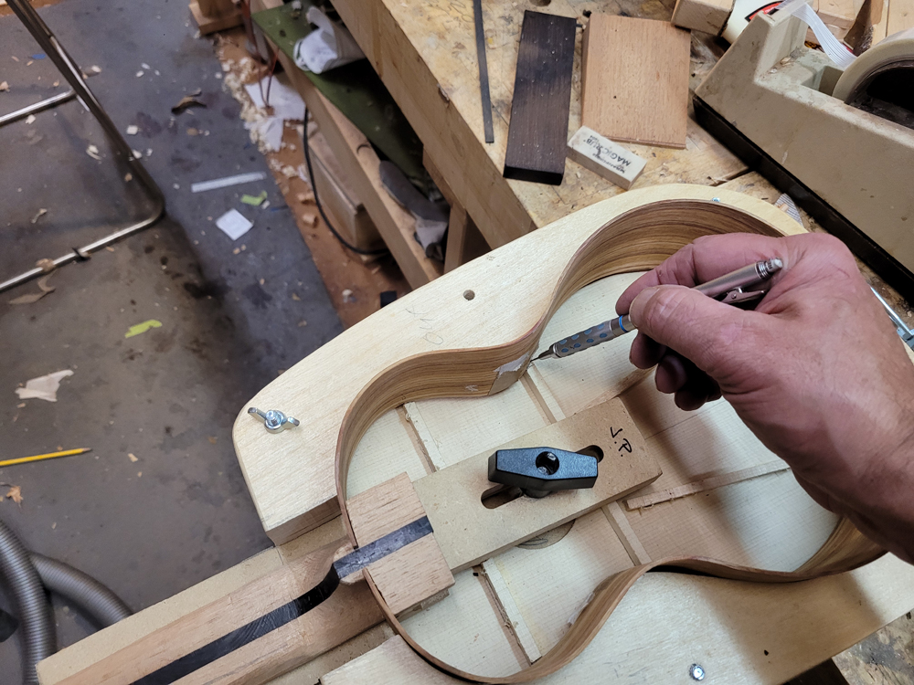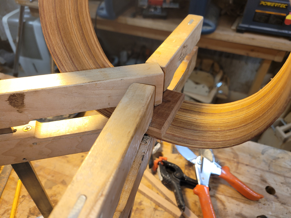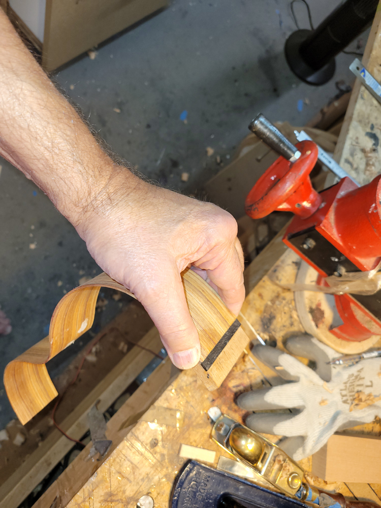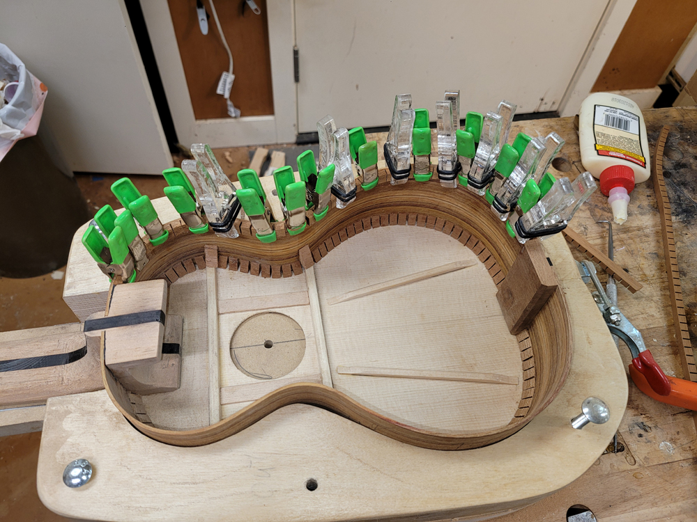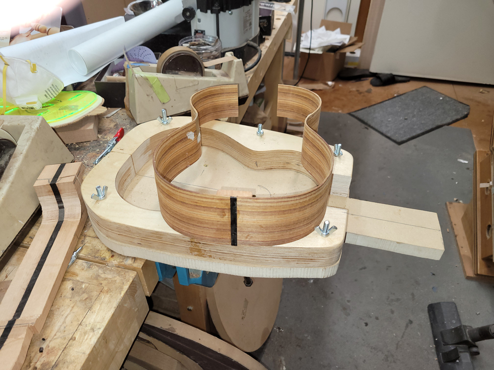 I profiled, thicknessed, and bent the sides for the rims. My eyes are not what they once were, so instead of pencilling in the profile lines I just taped on the template. Really easy to follow — with careful placement of the waist, I ended up with perfectly book-matched and profiled sides.