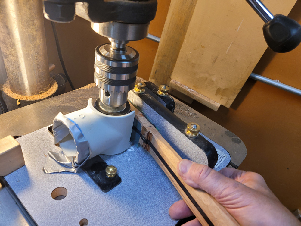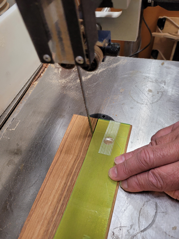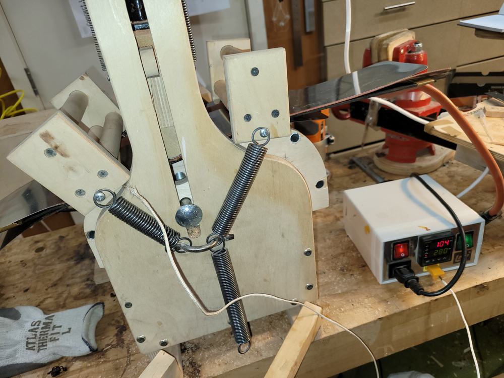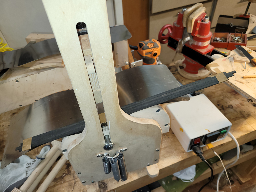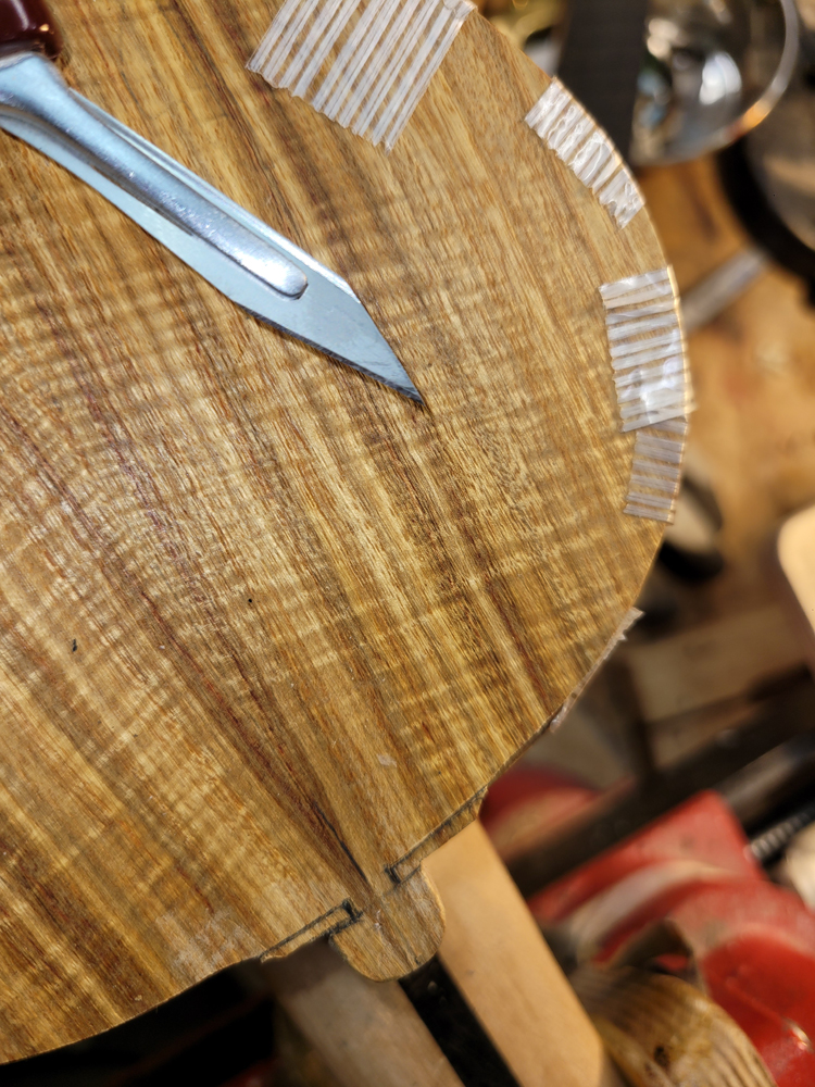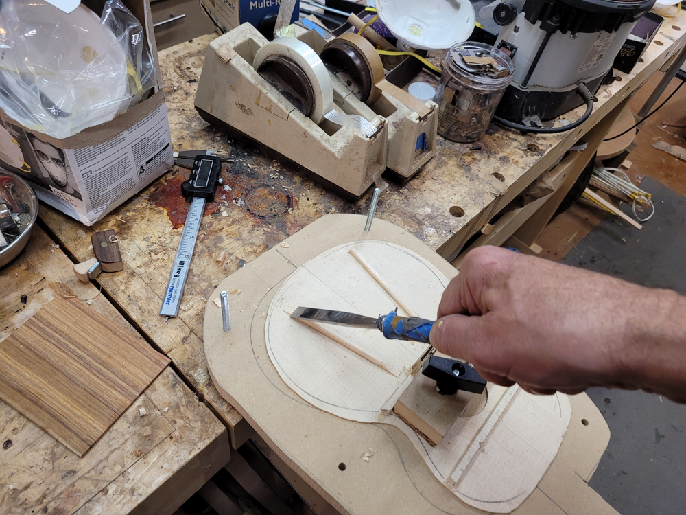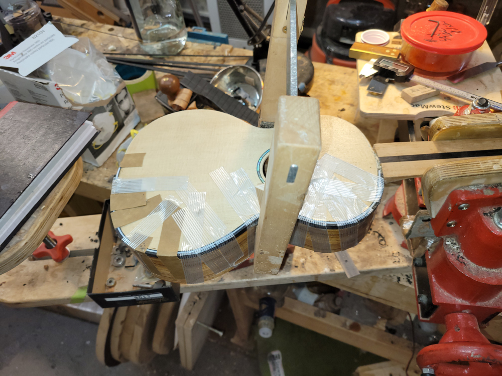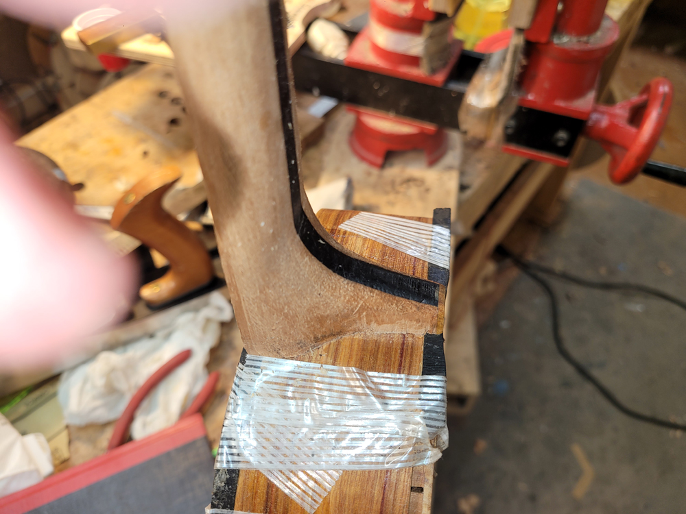 I profiled, thicknessed, and bent the sides for the rims. My eyes are not what they once were, so instead of pencilling in the profile lines I just taped on the template. Really easy to follow — with careful placement of the waist, I ended up with perfectly book-matched and profiled sides.
