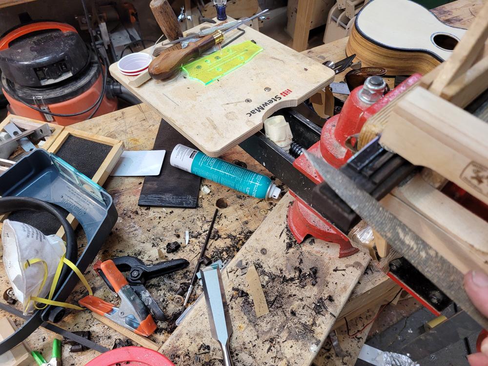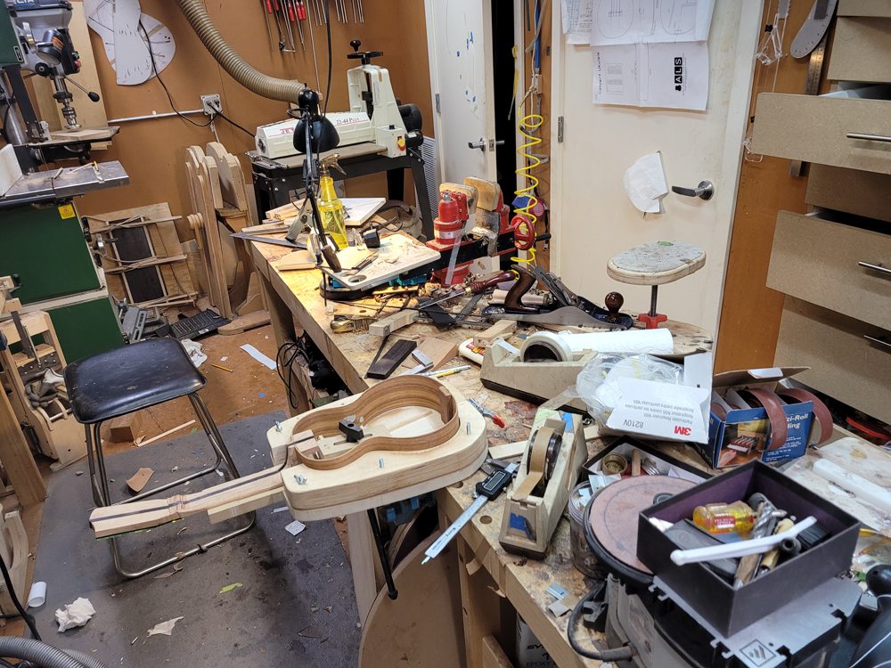 Yesterday I got a bit of time preparing to glue the rims to the top. First off I needed to straighten up the shop — it is amazing how quickly stuff piles up.