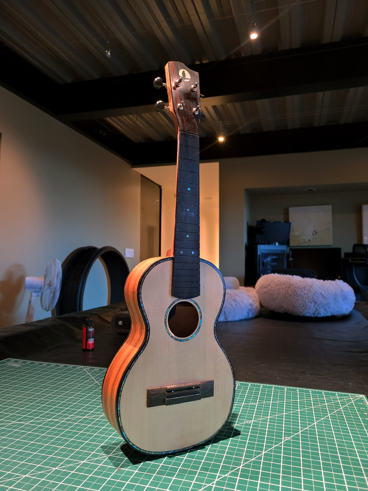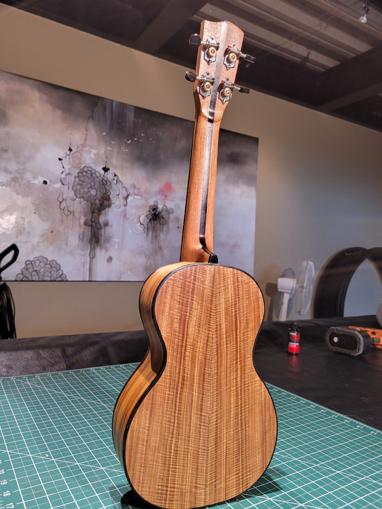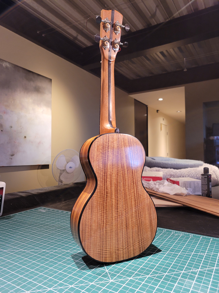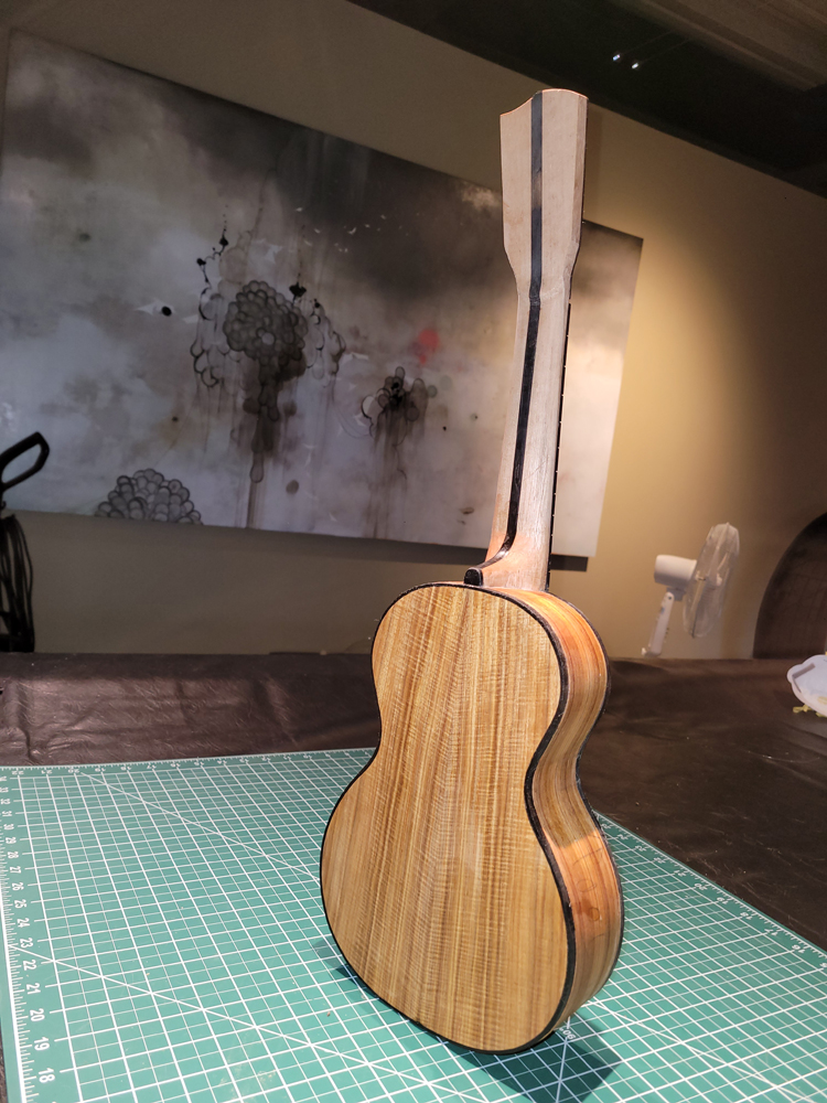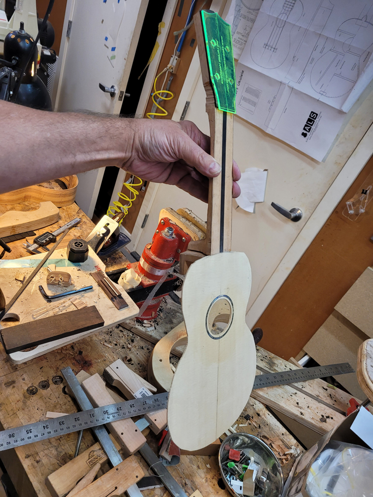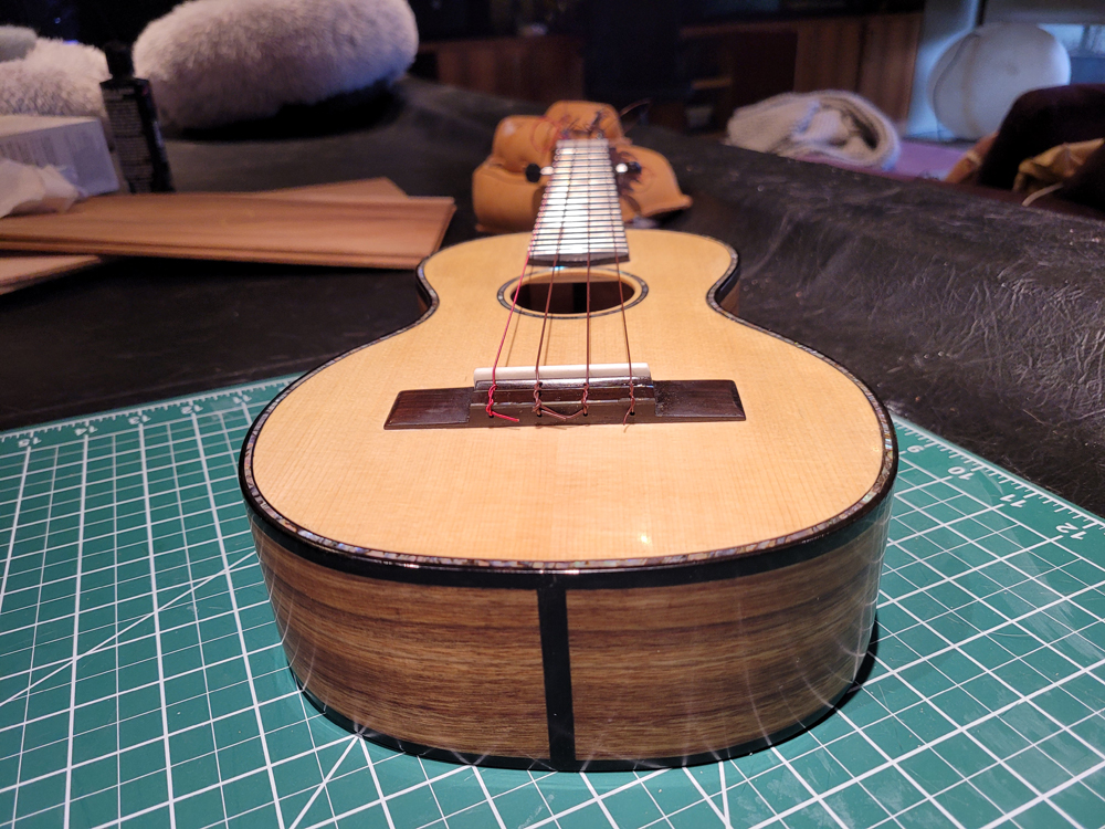 I now have the ukulele bound, but there were some steps along the way. Working with a traditional build method, having the neck aligned with the top is really easy — they are glued early in the process when you can see and align on a centreline. Care still needs to be taken at the tail end when the rims are glued to the top.