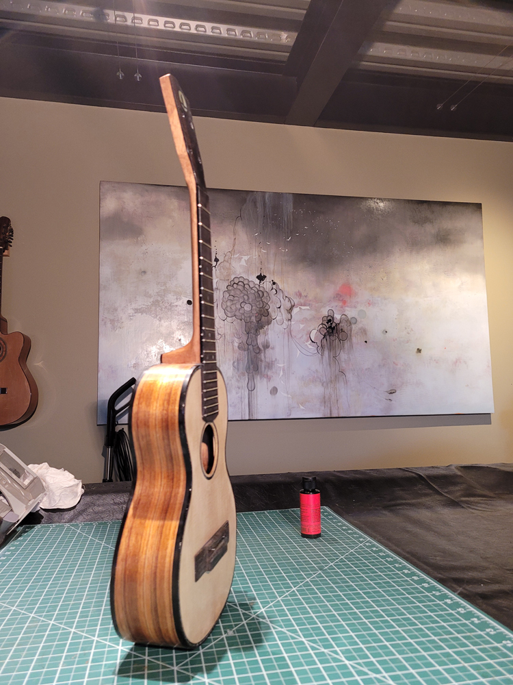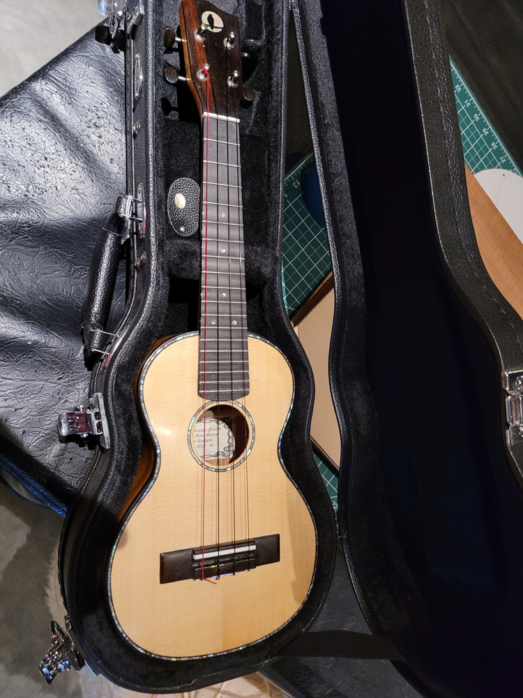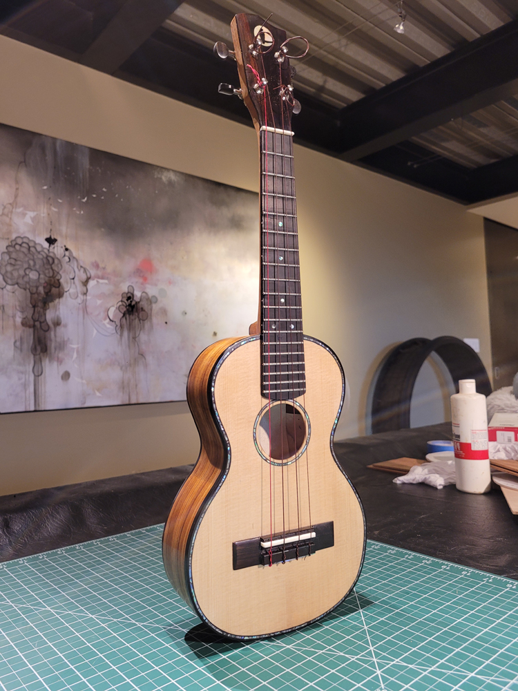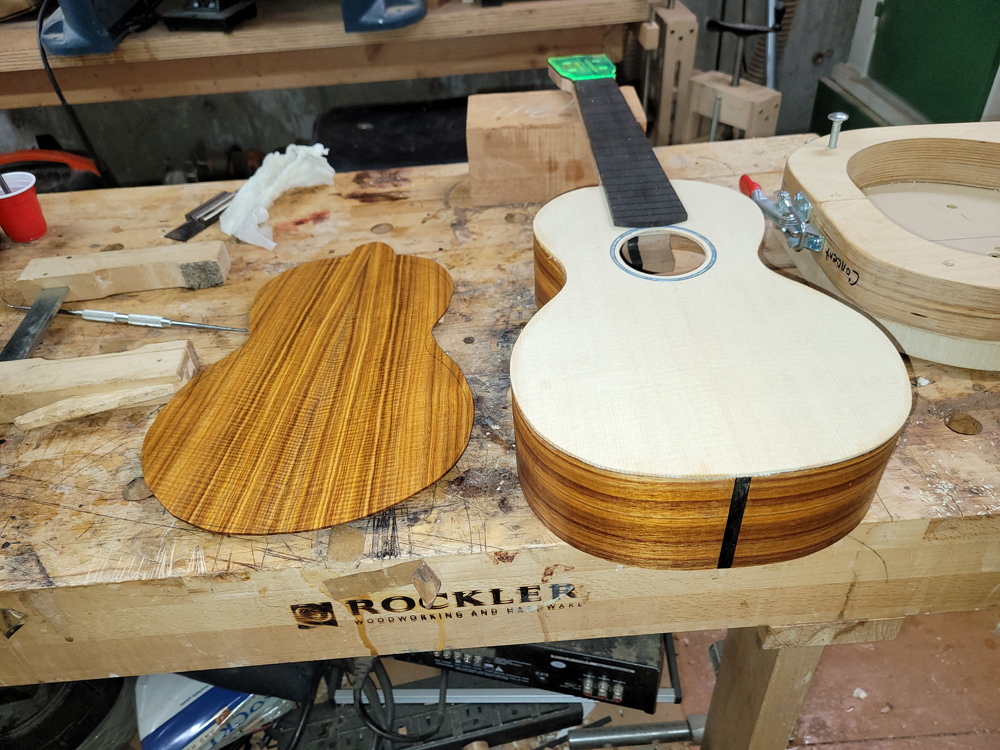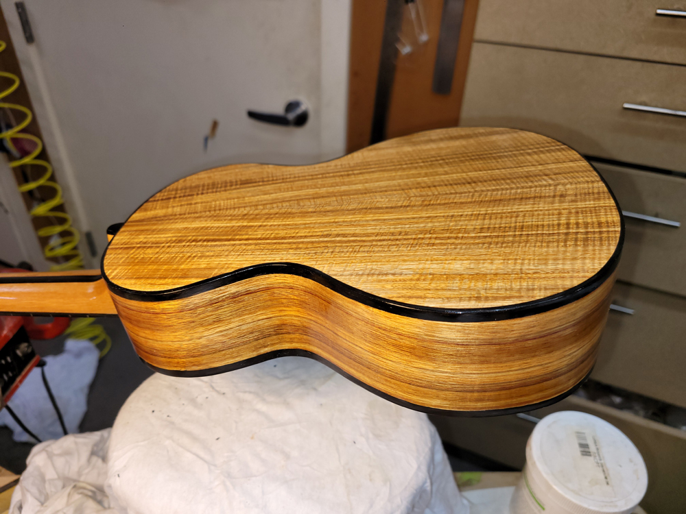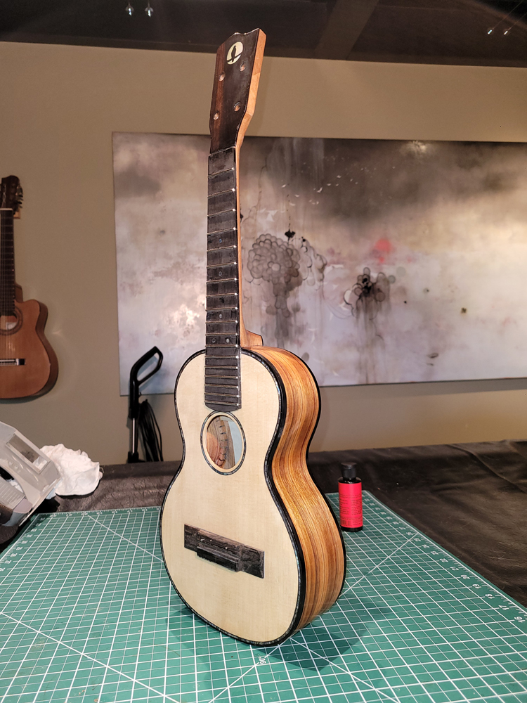 I now have the ukulele bound, but there were some steps along the way. Working with a traditional build method, having the neck aligned with the top is really easy — they are glued early in the process when you can see and align on a centreline. Care still needs to be taken at the tail end when the rims are glued to the top.