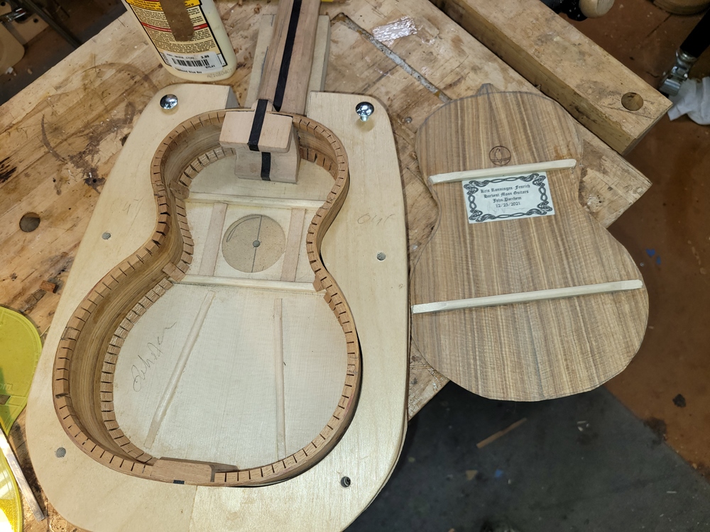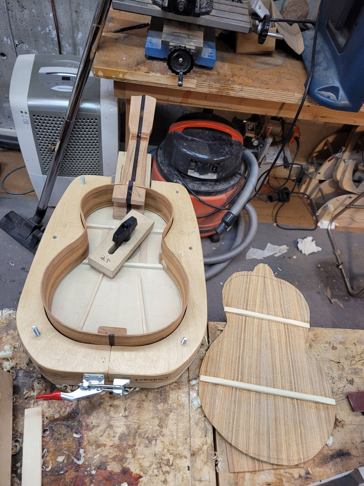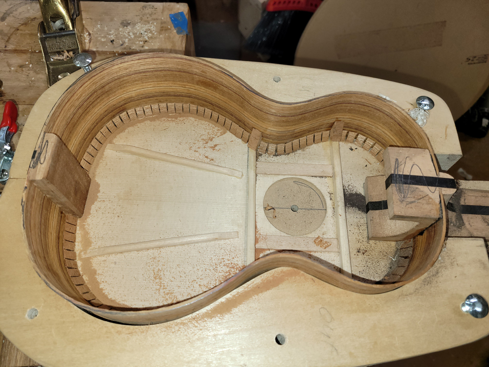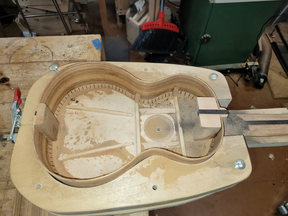 A quick update. I attached the rims and neck to the top. So far all is well. I used my flamenco/classical guitar peones for the transverse braces. I had thought about using a peones/kerfed lining hybrid installation method, but went traditional in the end.
