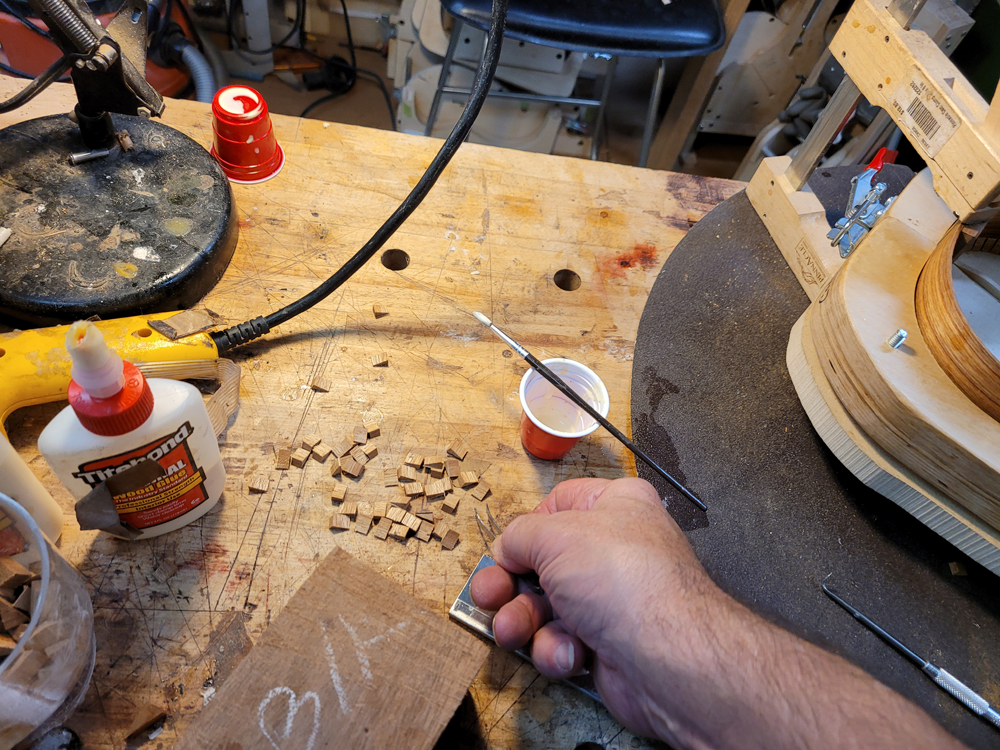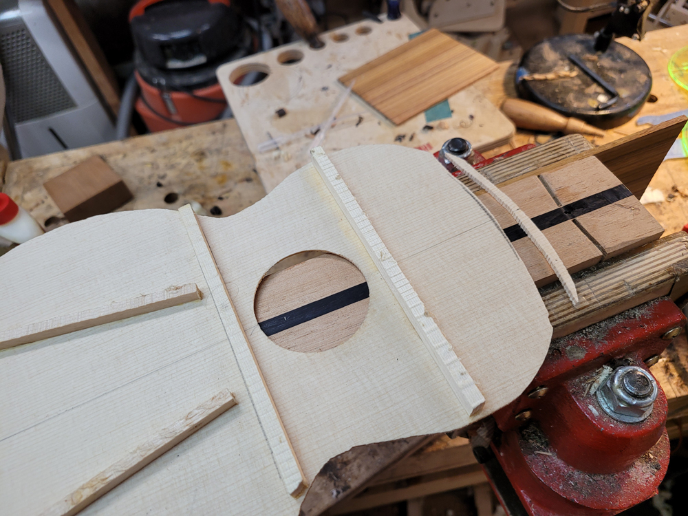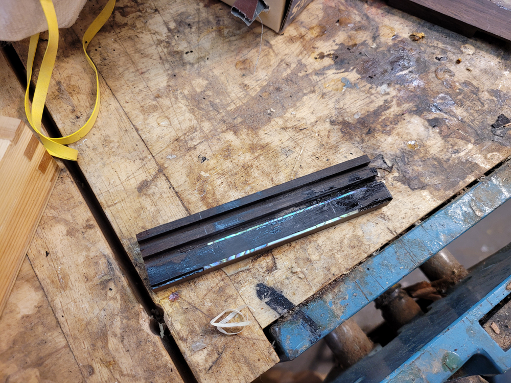 The Cat IncidentVery little damage — some shell popped off — except that a bit of shell at the tail end took a chip of the top with it, about 4mm by 4mm. I spent a few days trying different repairs, but any patch was framed by the cross-grain joint edge and looked wrong. It would have been a fine repair for an older damaged instrument, so I re-topped it instead. I had pictures of the re-top but accidentally deleted them when cleaning up.