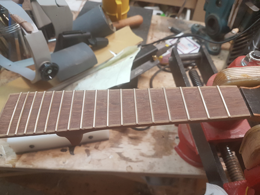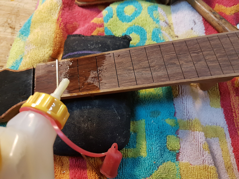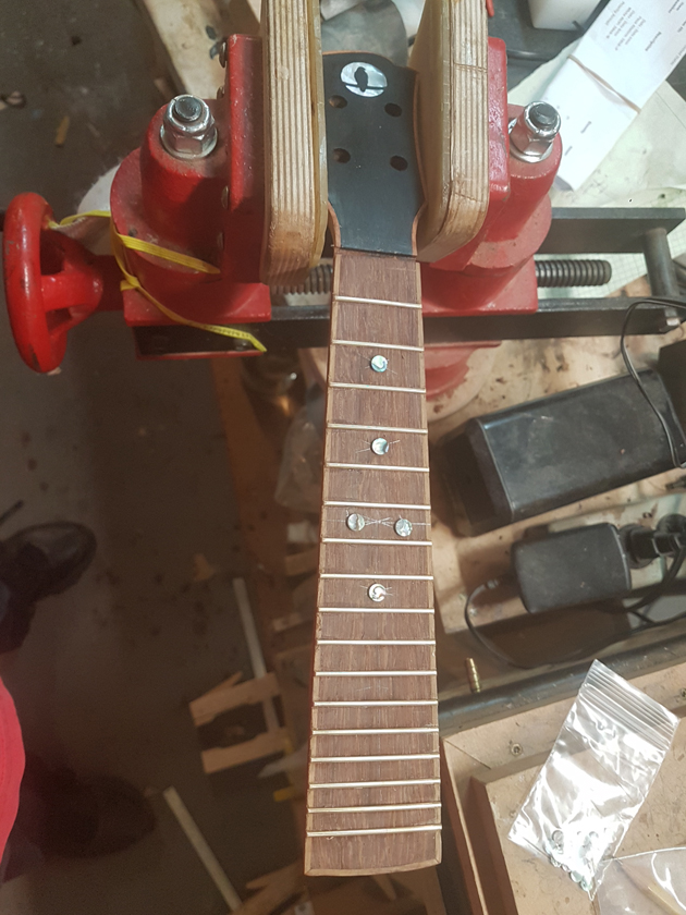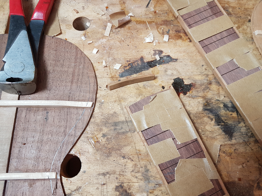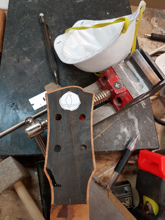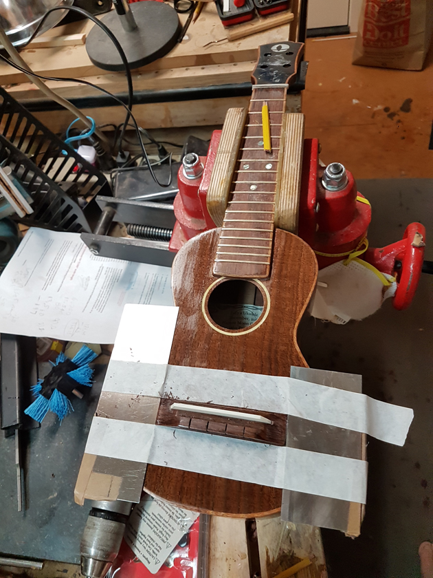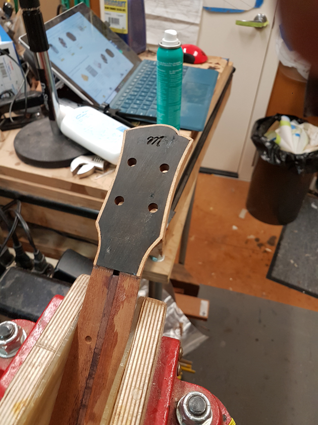 The fretboard binding is finished. I need to close the box by gluing on the back, but I’m waiting on the parents to get back with which twin gets which ukulele before gluing on the back — it will be easier to glue in a personalised label with the back off.