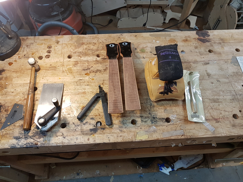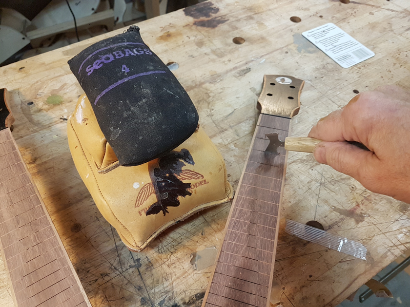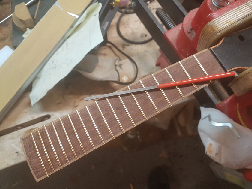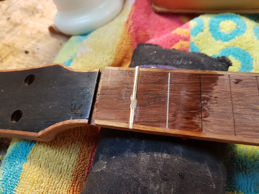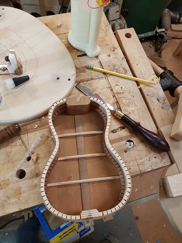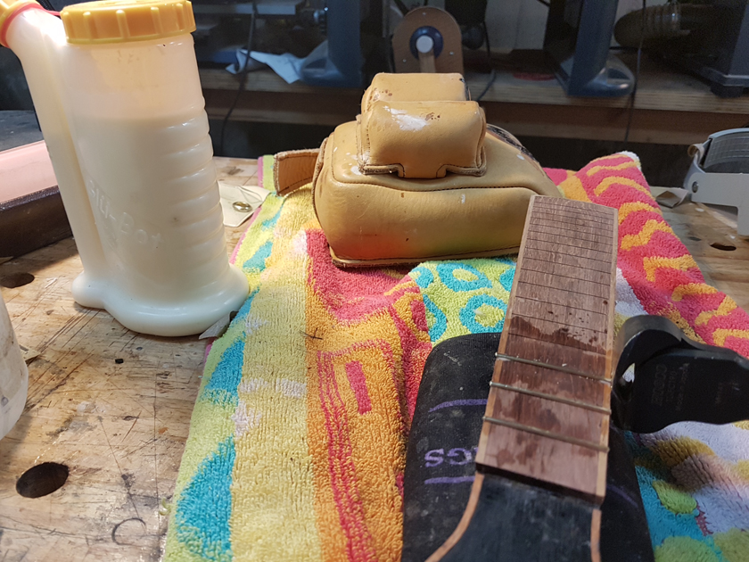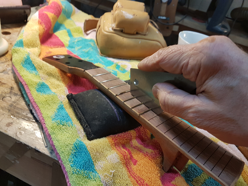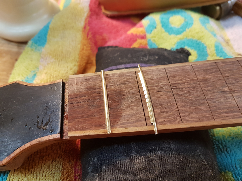 The fretboard binding is finished. I need to close the box by gluing on the back, but I’m waiting on the parents to get back with which twin gets which ukulele before gluing on the back — it will be easier to glue in a personalised label with the back off.