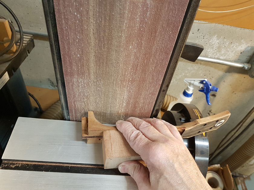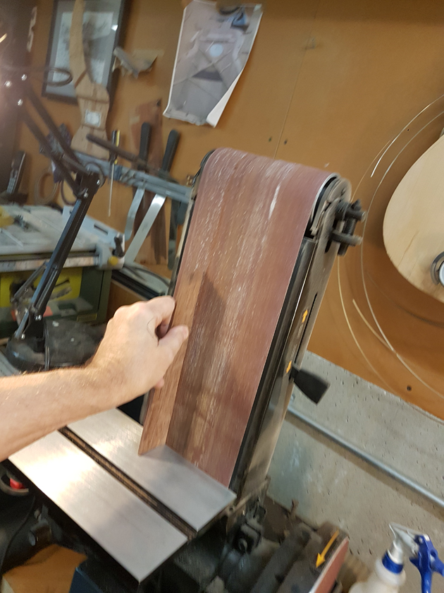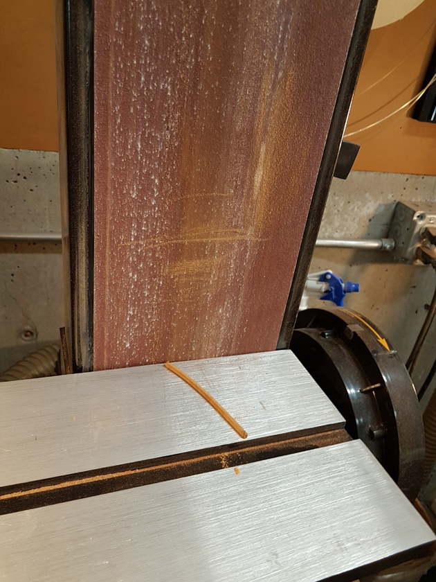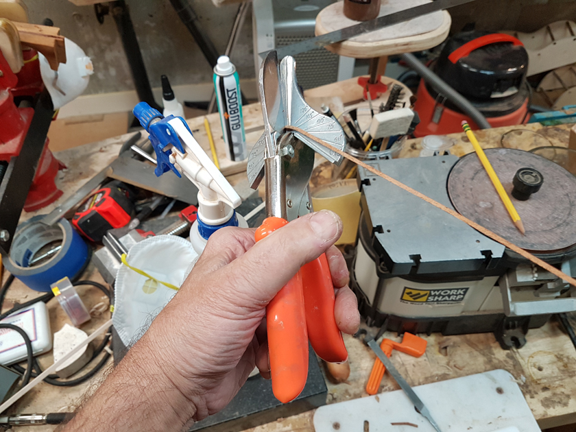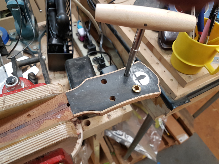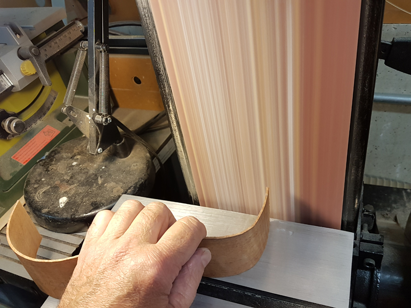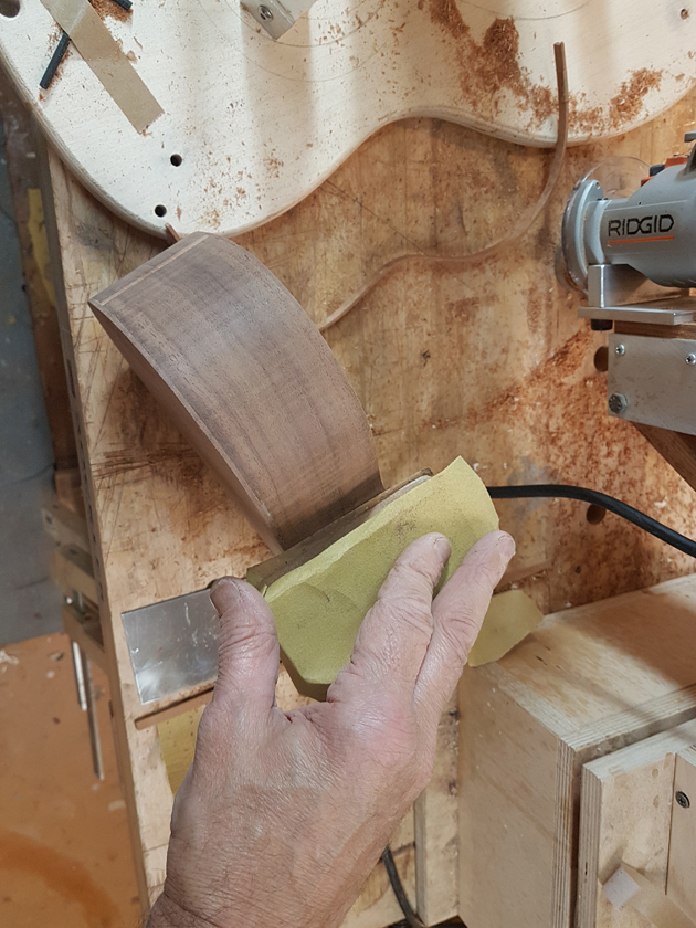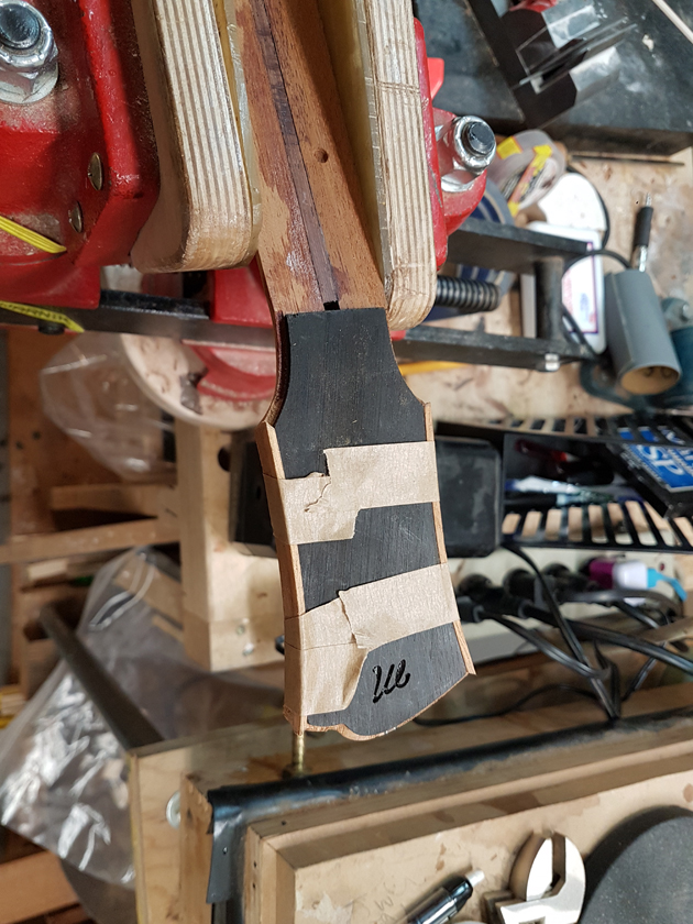 Moving on to the second neck. Having a better feel for the bends, I was able to quickly bind the headstock. I switched to a mitre cutting tool instead of the belt sander — not sure why I didn’t use it on the first one.