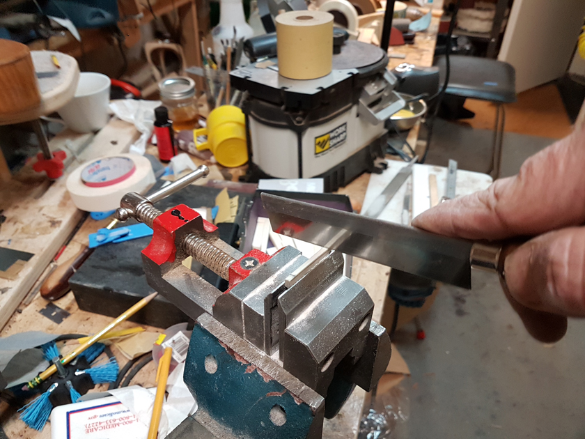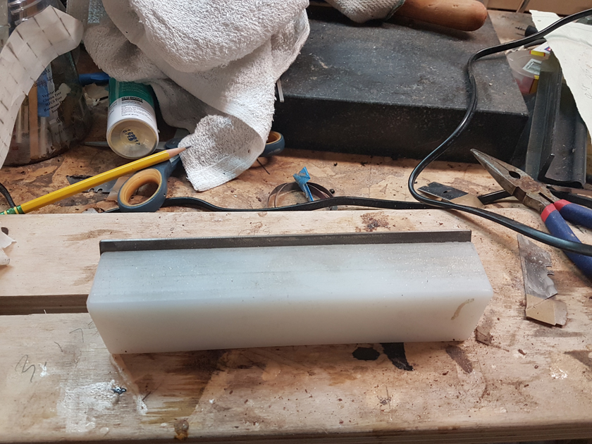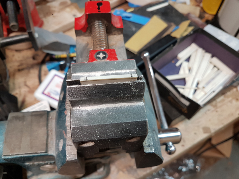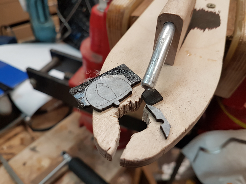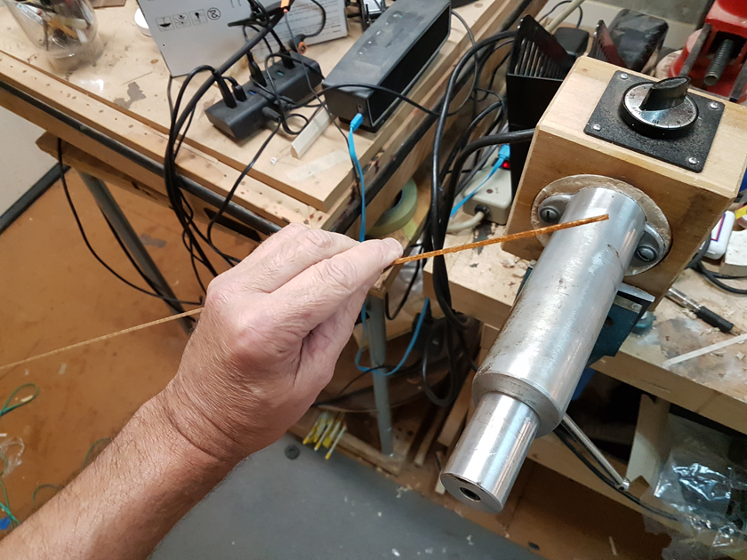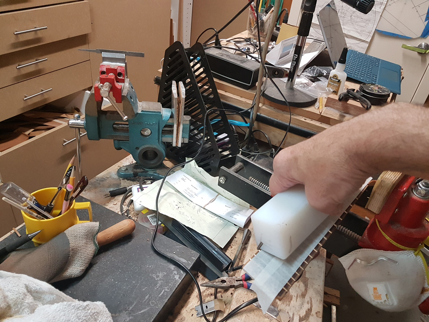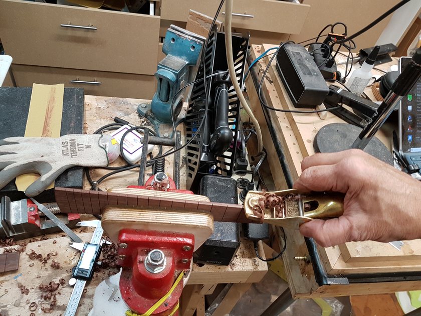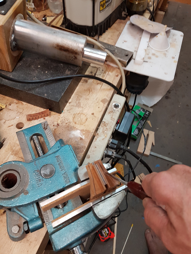 Moving on to the second neck. Having a better feel for the bends, I was able to quickly bind the headstock. I switched to a mitre cutting tool instead of the belt sander — not sure why I didn’t use it on the first one.