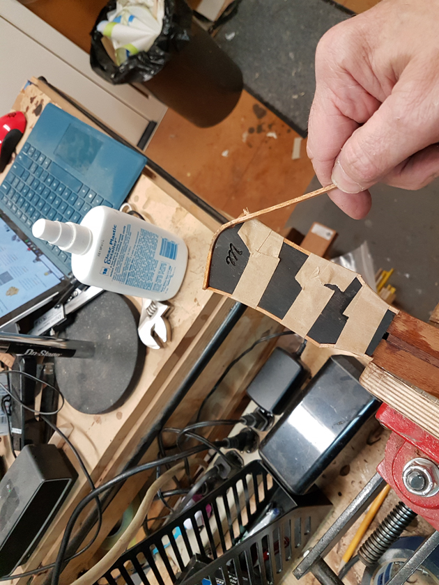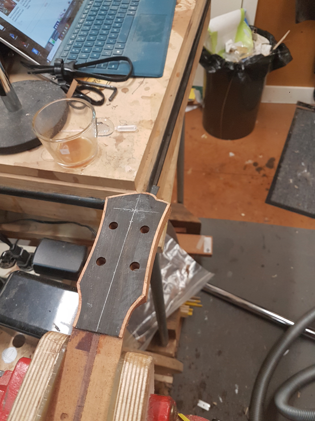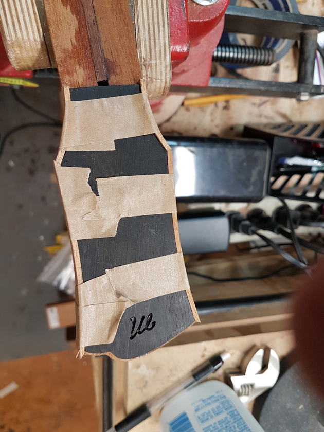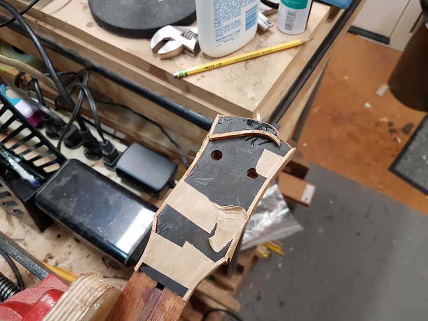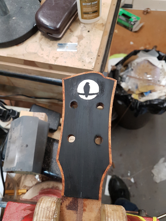 I have never bound a headstock before — hoping to avoid the tight curves and mitres. I decided to try binding these with CA glue, working a small section at a time. The first attempt was a learning experience; by the second headstock I had a much better feel for the bends.