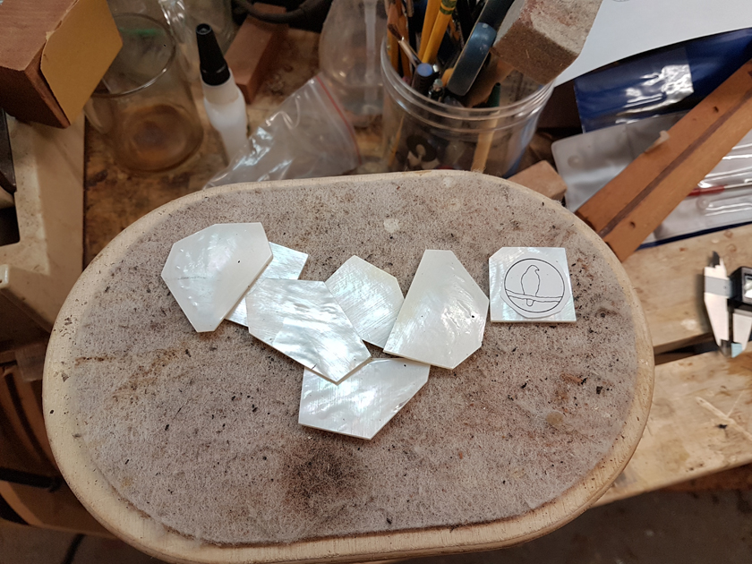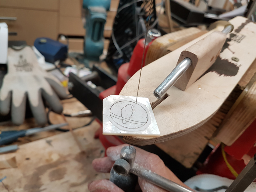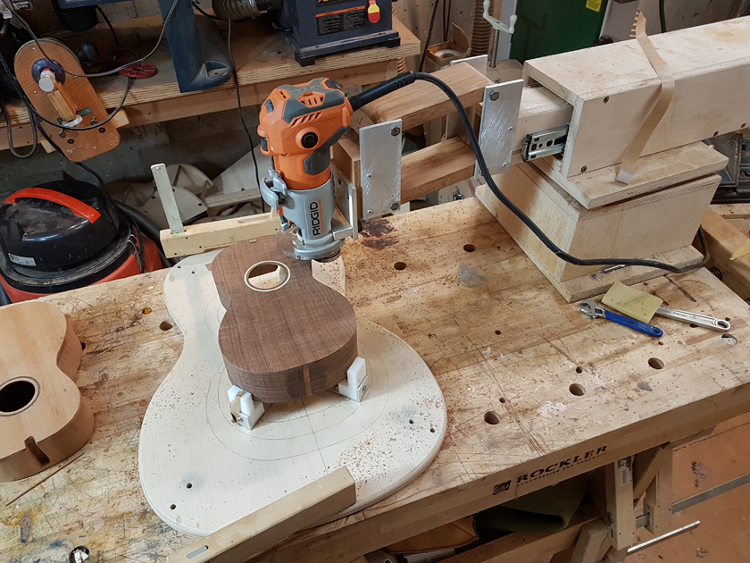 I am making these fancy. I was able to close up the ukuleles and bind them in the last couple of days. Before closing them up I made personalised labels for the twins and flush-routed the tops.