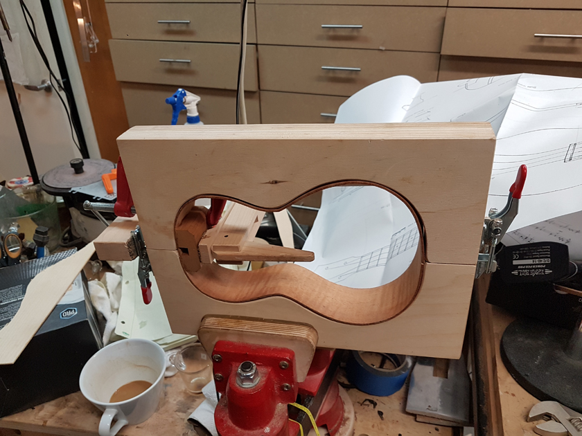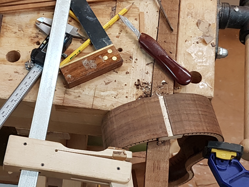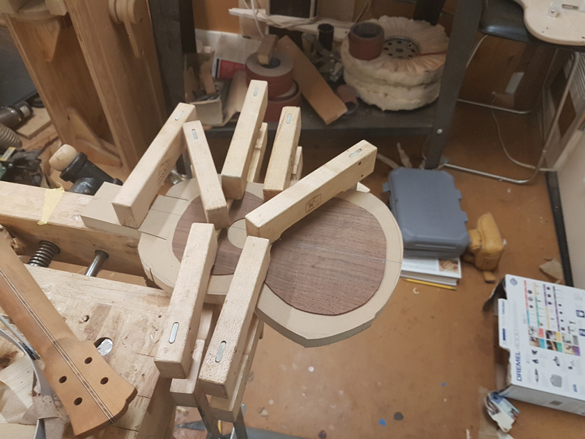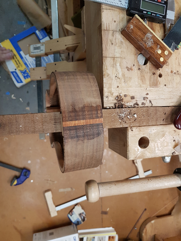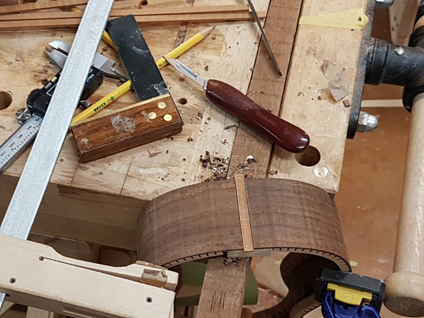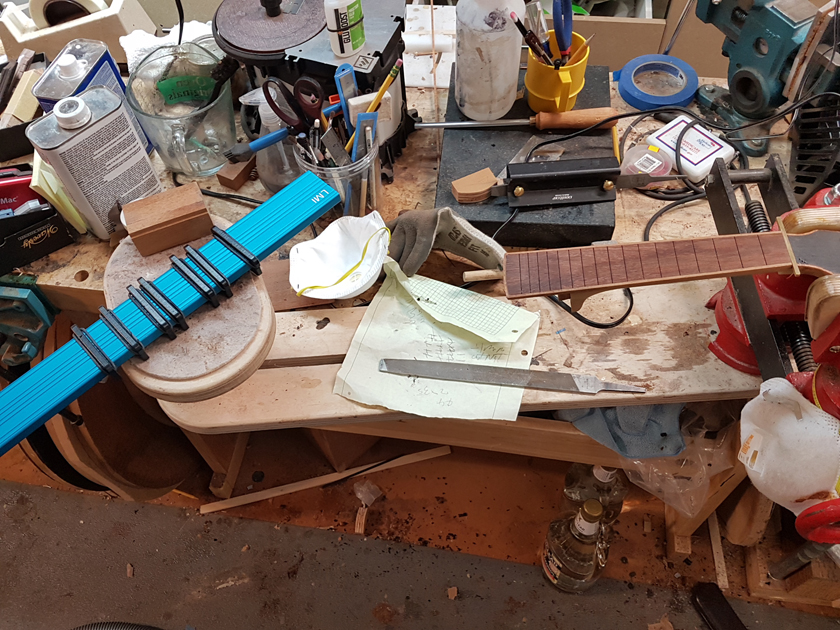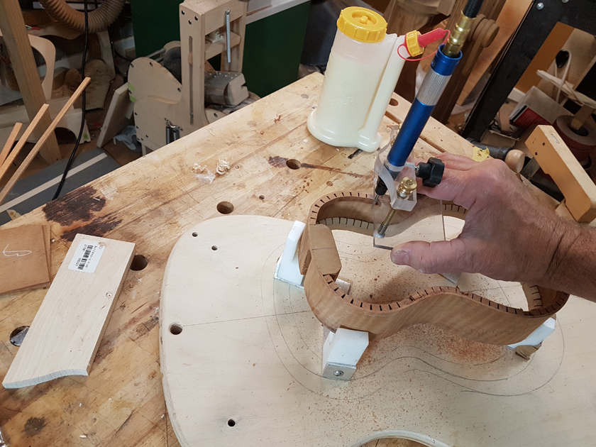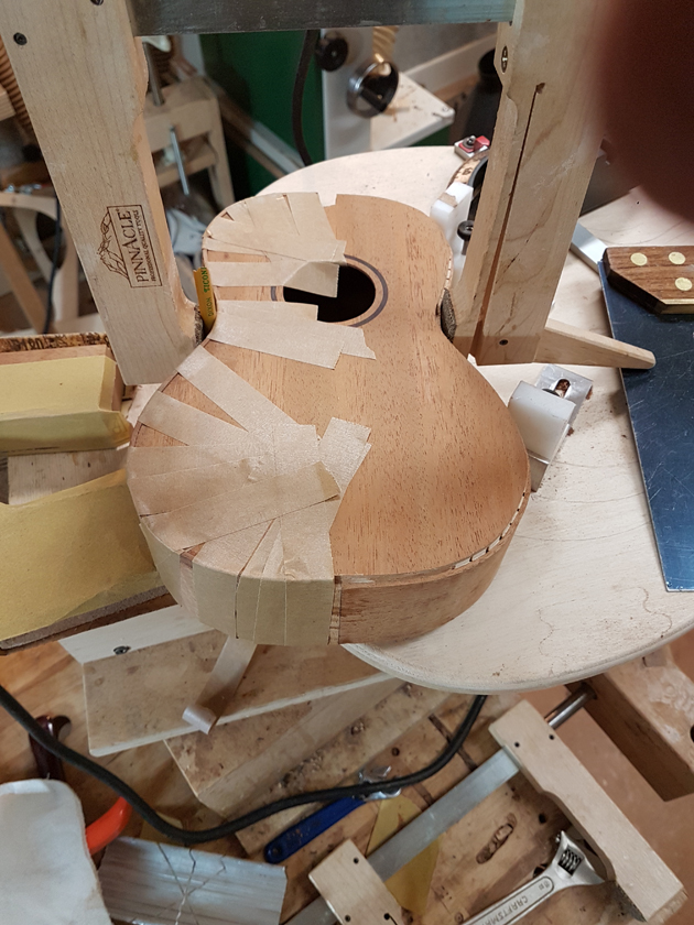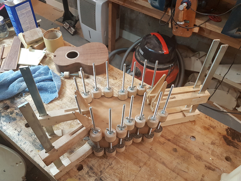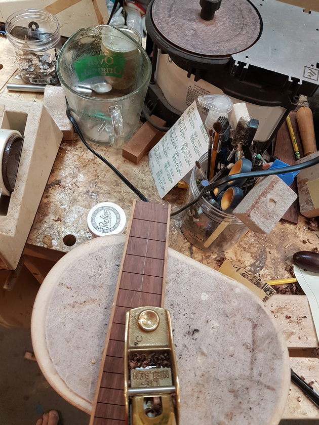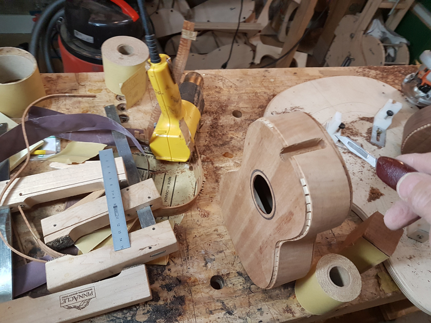 I am moving along, hoping to be finished in time for Christmas. I got a chance to try my new fretboard caul with replaceable radius inserts. I also spent time cleaning up the bindings, levelling the top, back and rims.