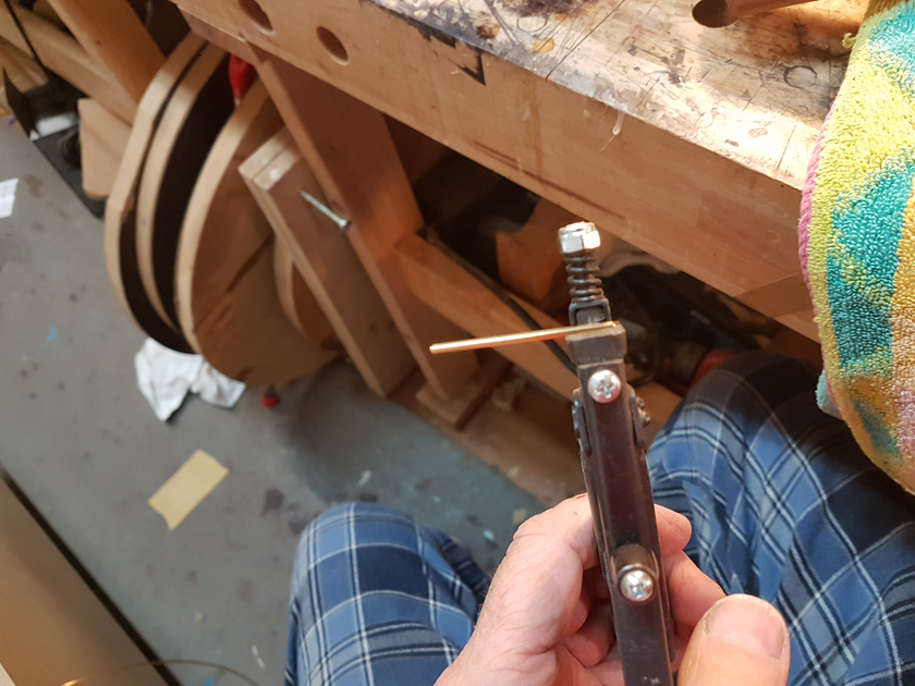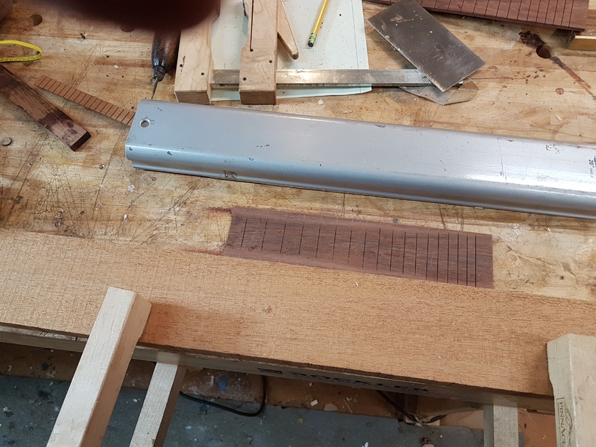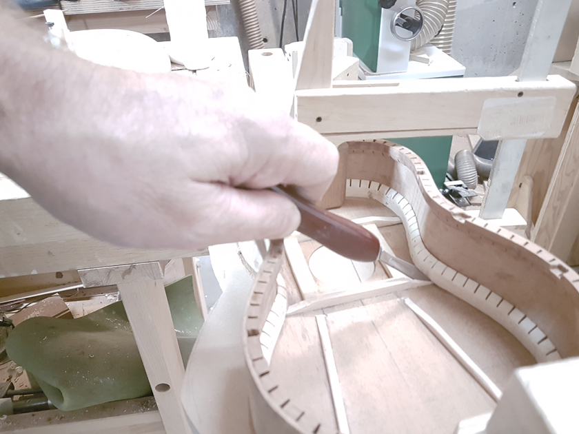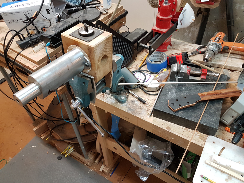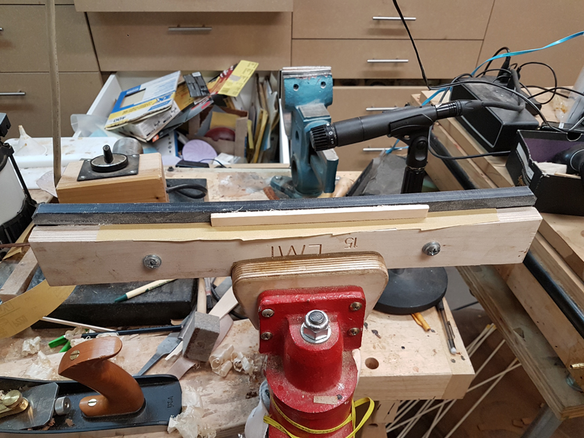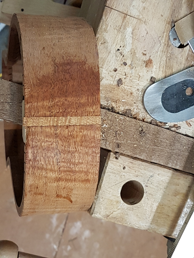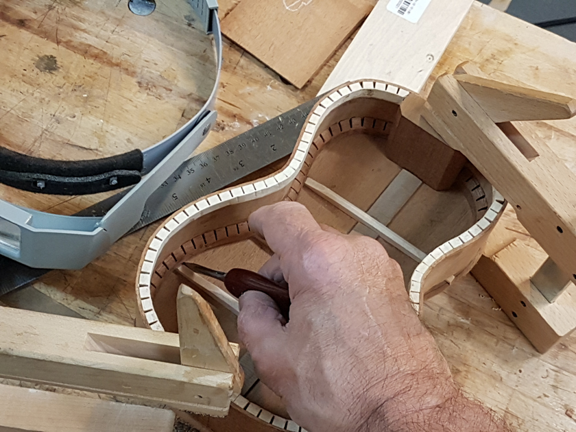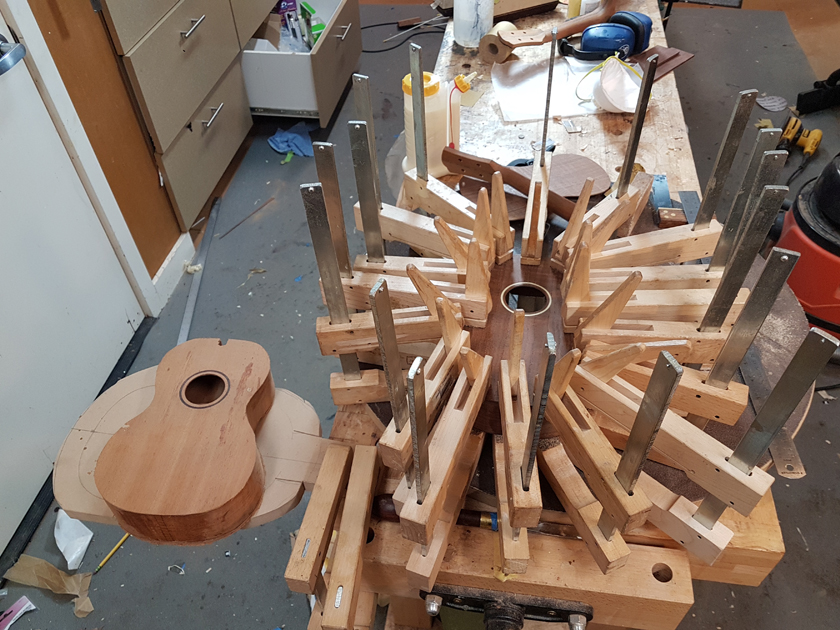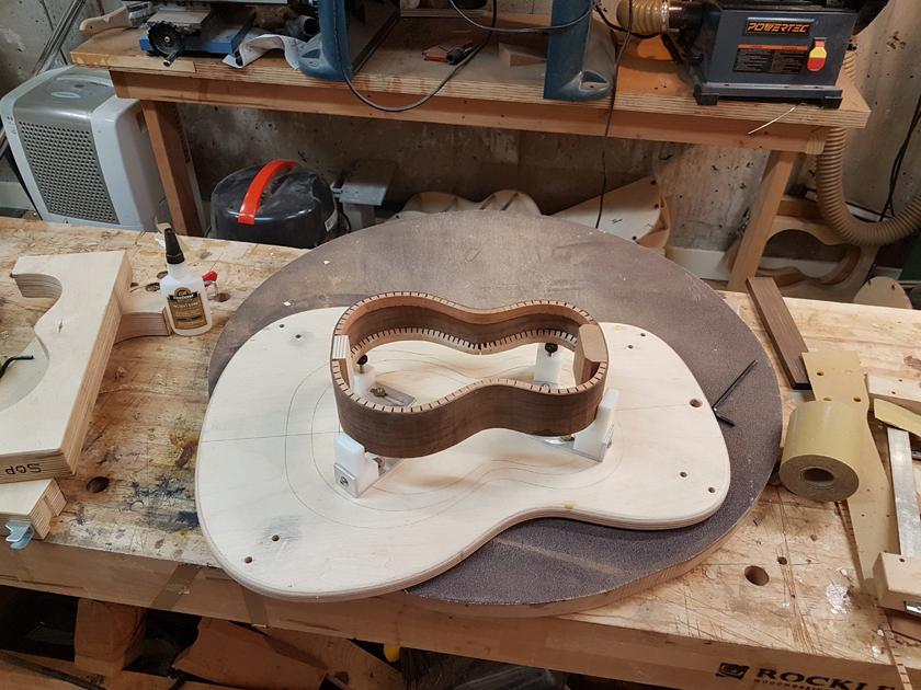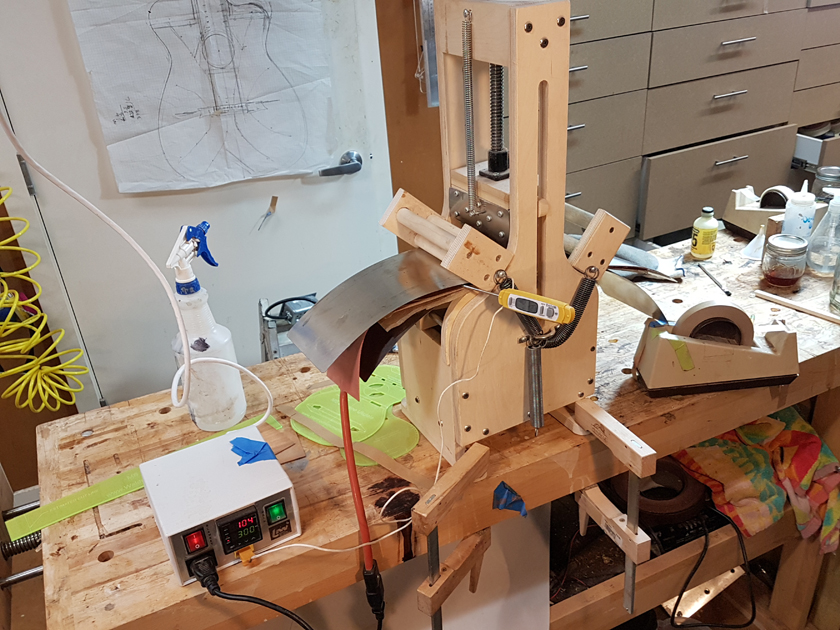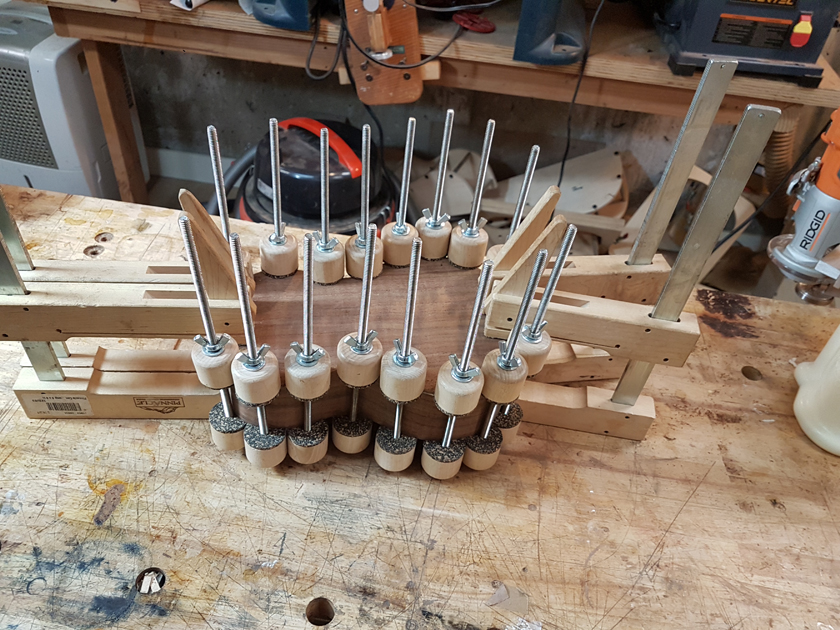I am moving along, hoping to be finished in time for Christmas. I got a chance to try my new fretboard caul with replaceable radius inserts. I also spent time cleaning up the bindings, levelling the top, back and rims.