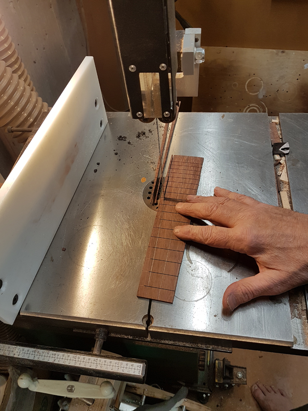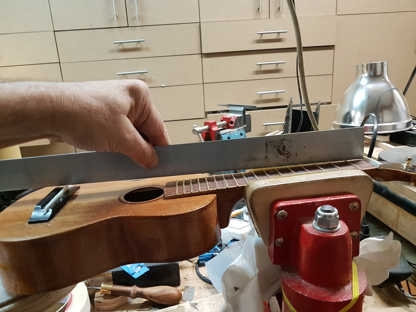 Setup Details I used a straightedge from the first fret to the saddle to measure the action, aiming for 3mm as a rough starting point. For the nut slots I used a razor saw, checking alignment by using the reflection in the saw blade — the reflected nut should look like a continuation of the nut. A simple trick for getting square, accurate slots.