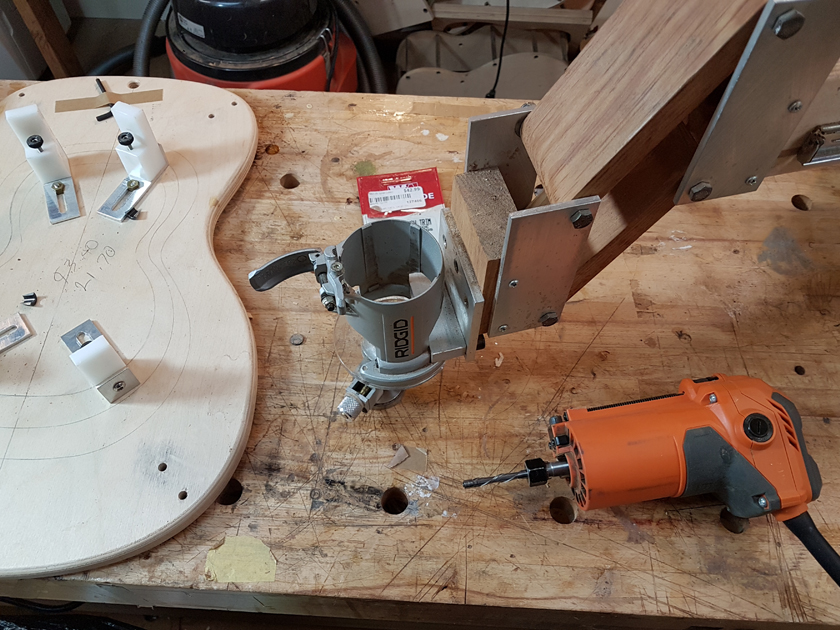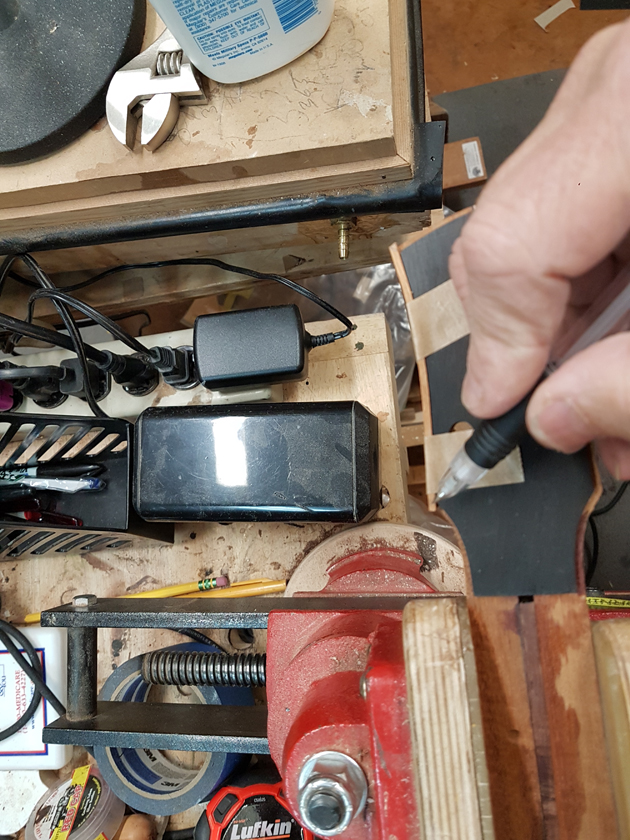 The Inlay ToolDave asked about the tool I was using for inlay work. It’s a 1/8″ pneumatic pencil-type die grinder with an inlay base from John Hall at Blues Creek Guitars. I use it for all my inlay routing — it gives much more control than a full-size router for the small detailed work.