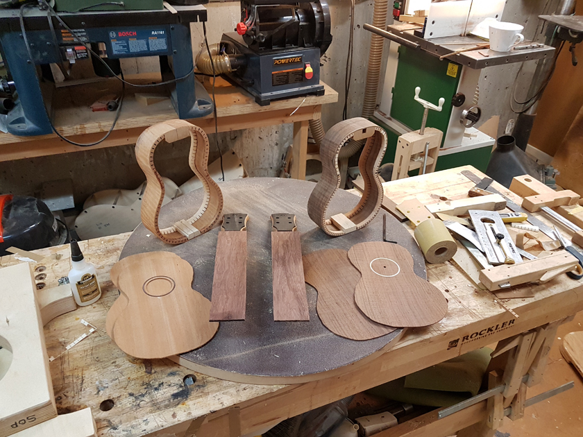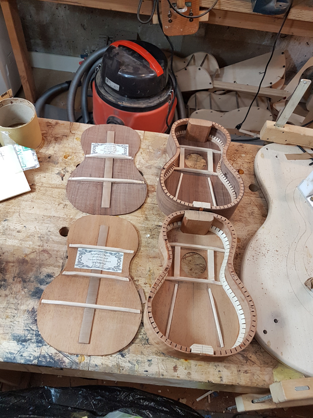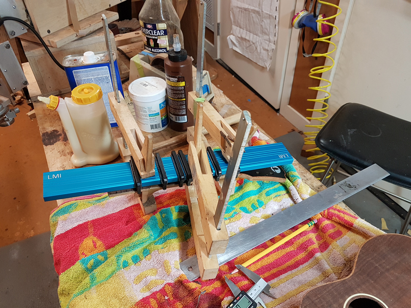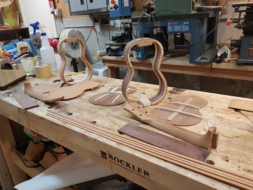 A while back I bought a box unseen of ukulele parts from a really good luthier who decided against making ukuleles. The box had joined and profiled plates, pre-made necks with headstock veneers, and various supplies. Perfect starting point for a pair of sopranos.