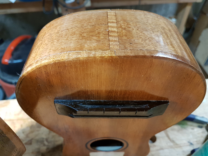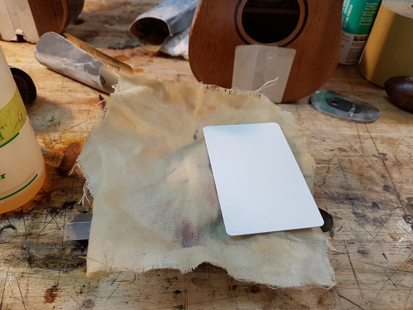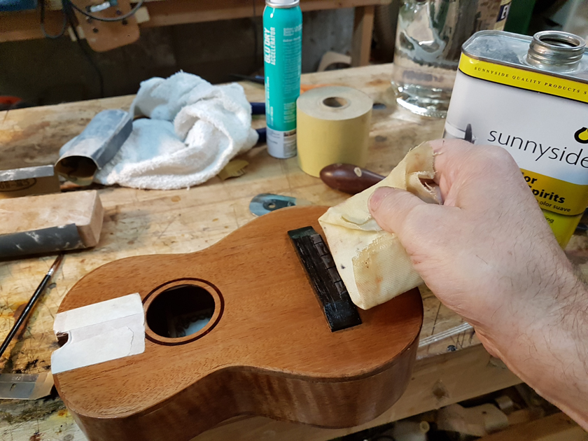 It is a real pain to French-polish with the bridge in the way. To get a clean finish close to the bridge I pulled the cover from my muñeca and wrapped it in a blank name badge card. It did help me get close.