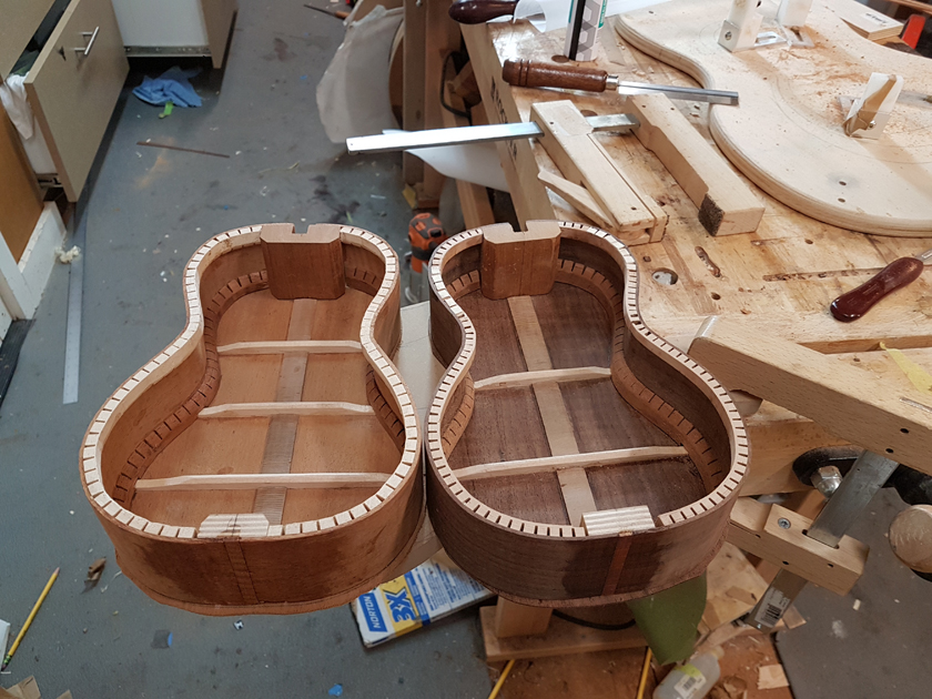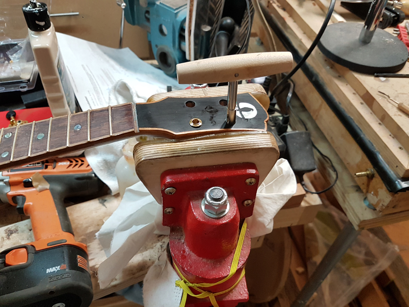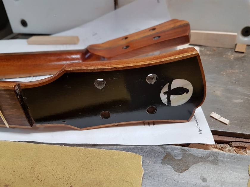 I pore-filled the necks with GluBoost finish CA and French-polished them as well. Then glued the necks on — previously fitted including flossing the cheeks for the neck angle and good contact. Sorry, no pictures of the neck glue-up.